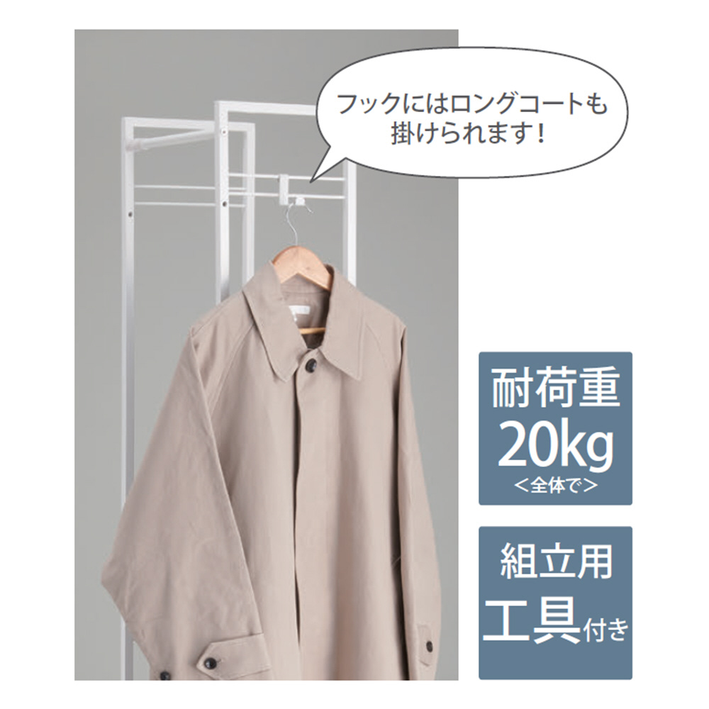 ●耐荷重:全体で約20kg(伸縮パイプ1本あたり/約10kg、フック/約2kg)