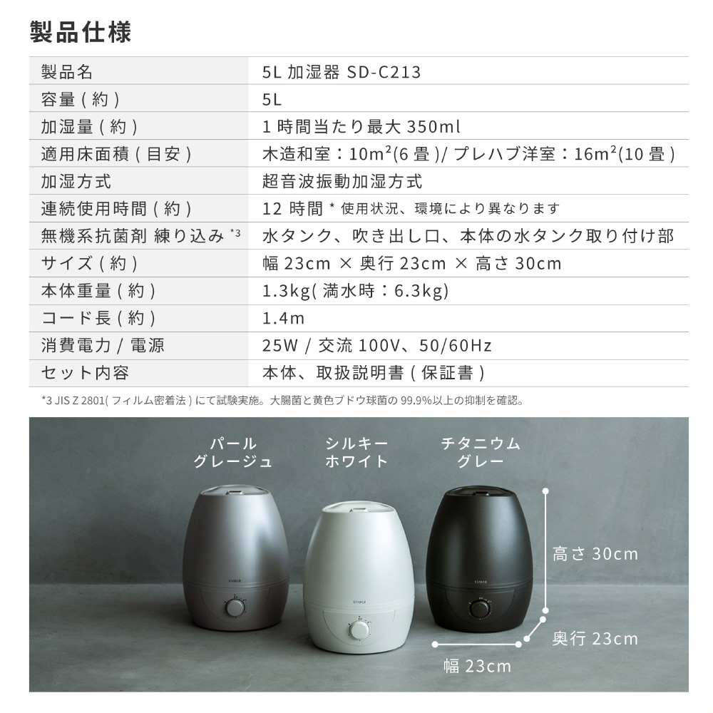 5L加湿器 siroca シルキーホワイト SD-C213W [超音波式]