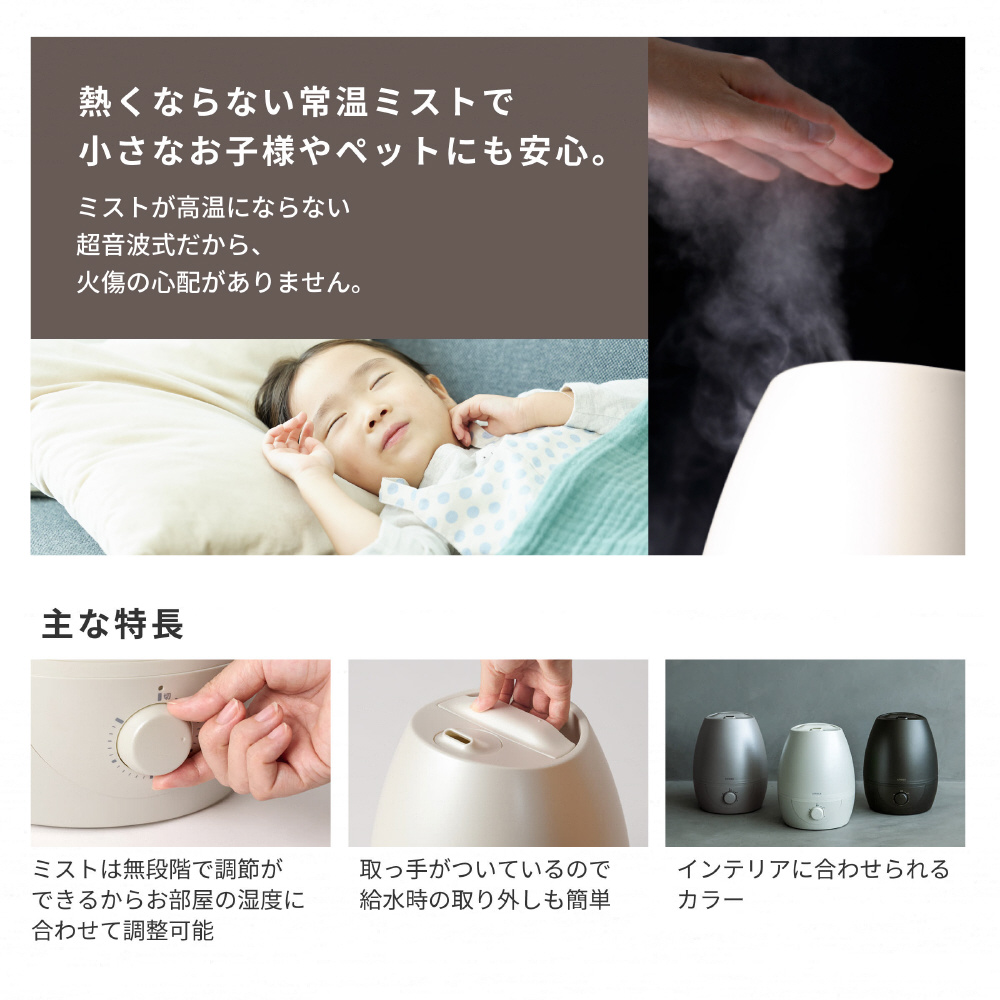 ミストは無段階で調節ができるからお部屋の湿度に合わせて調整可能