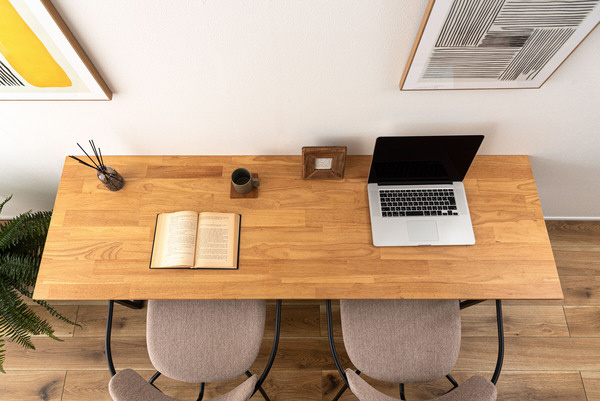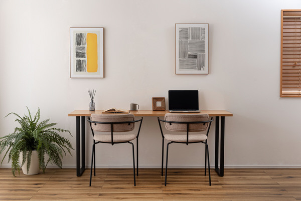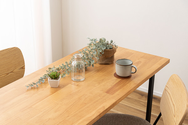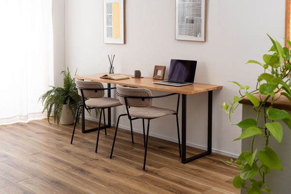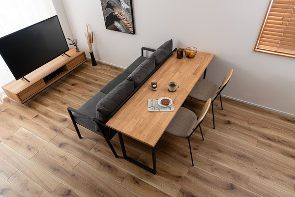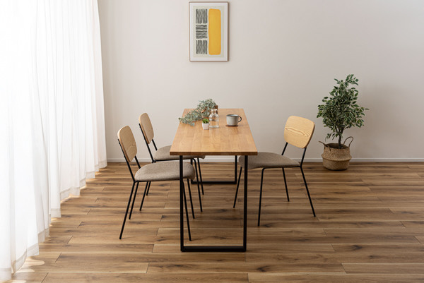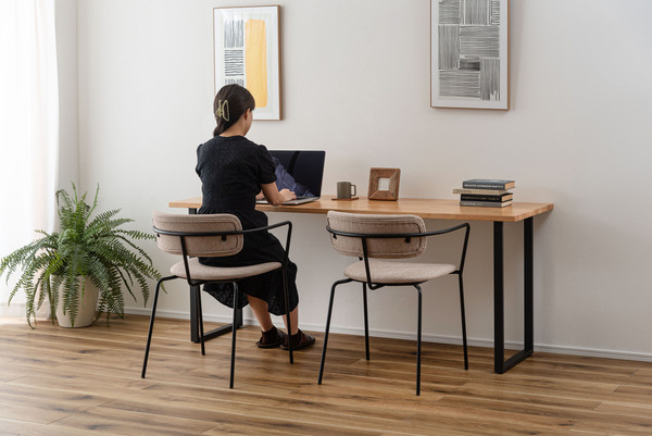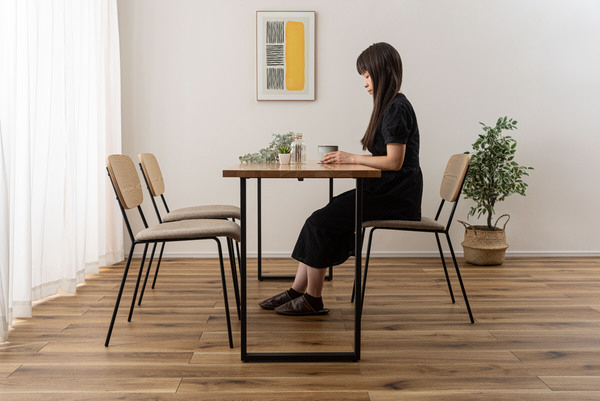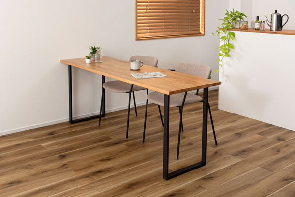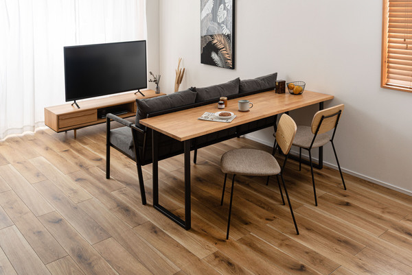 豊かな天然木の表情を活かし、圧迫感のないスリムでモダンなデザインに仕上げました。ハイカウンターとは違ったダイニングサイズの高さ設計はリモートワークやキッチンカウンター、リビングダイニング風などレイアウトの幅が広がります。