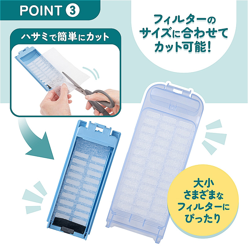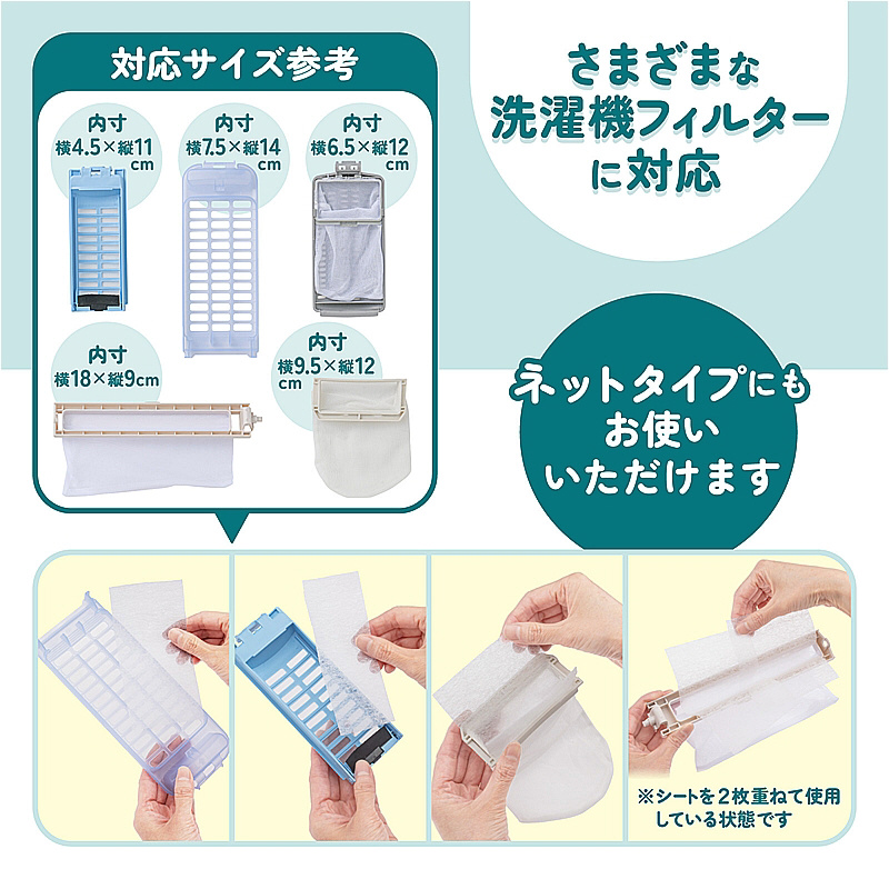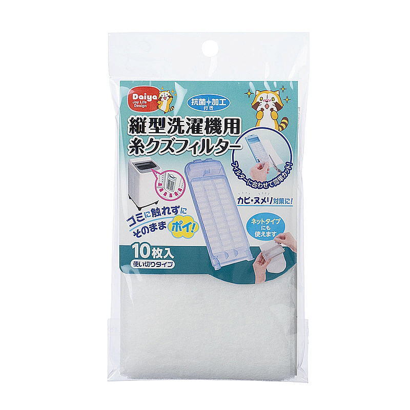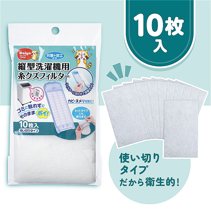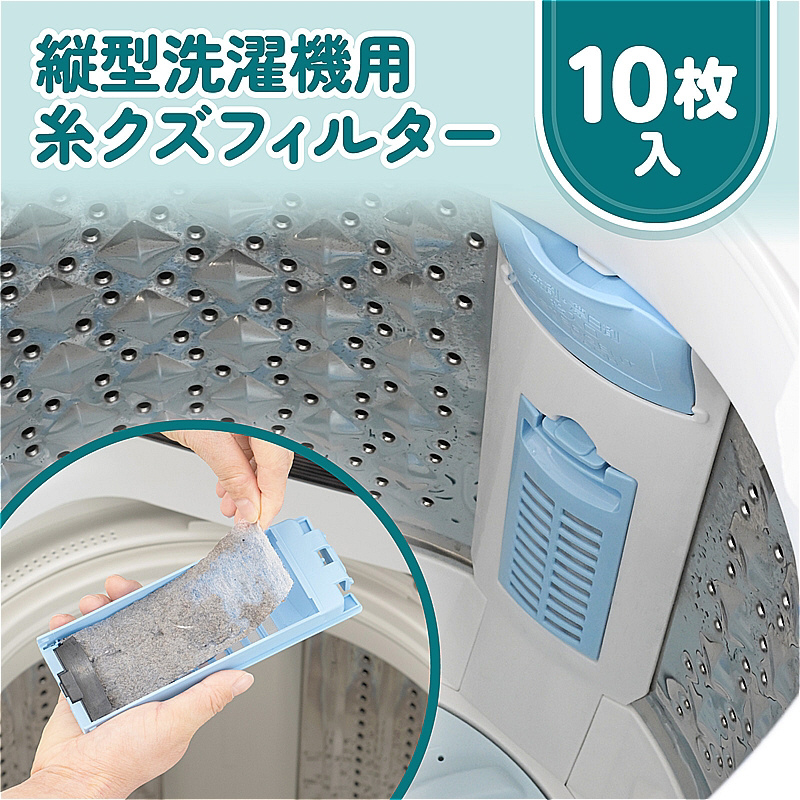 縦型洗濯機用糸クズフィルターです。目の細かい不織布のフィルターが、糸クズや髪の毛をキャッチします。 フィルターに合わせて簡単にカットできます。洗濯機の糸クズフィルター本体に取り付けて、使用後は取り外すだけでゴミに触ることなく、簡単に捨てることができます。抗菌加工付きでカビ・ヌメリ・ニオイ・雑菌の発生を抑え、清潔に保ちます。使い切りタイプだから衛生的です。10枚入り