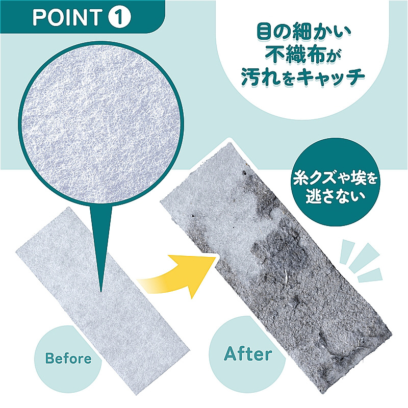 目の細かい不織布のフィルターが、糸クズや髪の毛をキャッチします。