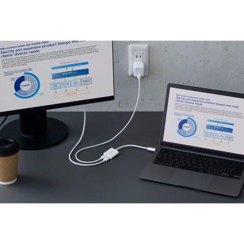 大画面での作業も、通話や配信も、つなぐだけで快適に。スマートフォンやパソコンを充電しながら、映像出力・音声の入出力・データ転送が同時にできるUSB Type-C(TM)変換アダプターです。最大92Wの高出力に対応し、USB Type-Cプラグと2つのUSB Type-Cポートを搭載。外部ディスプレイへの映像出力やイヤホンを使った通話・ライブ配信、動画視聴、データのバックアップなど、さまざまな作業をバッテリー残量を気にせずに行えます。