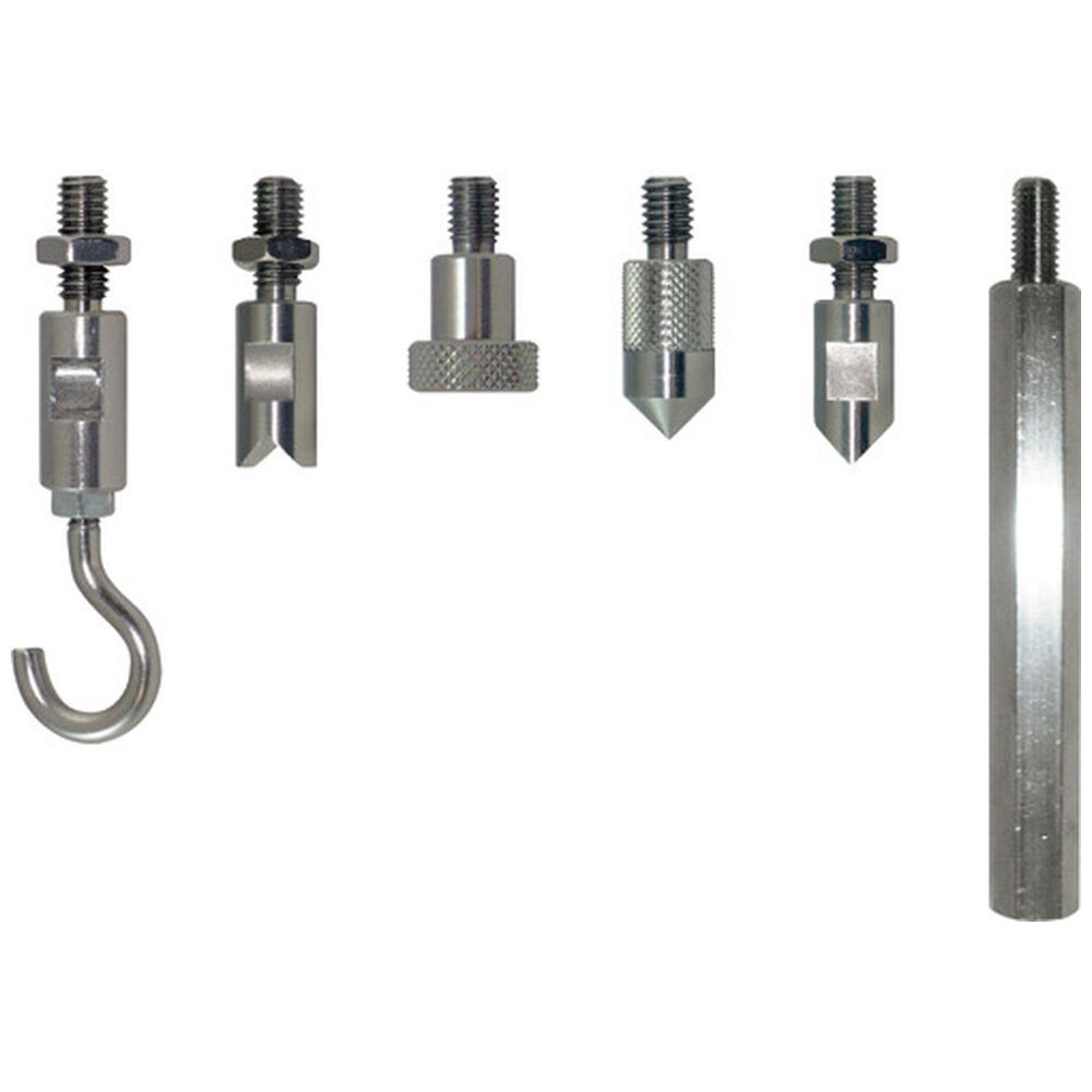 ■フック(型式: JM-X002-500N)、V溝圧子(型式: JM-X003-500N)、受圧板φ15mm(型式: JM-X004-500N)、円錐圧子(型式: JM-X005-500N)、山形圧子(型式: JM-X006-500N)、延長ロッド(型式: JM-X007-500N)の6治具のセットです。