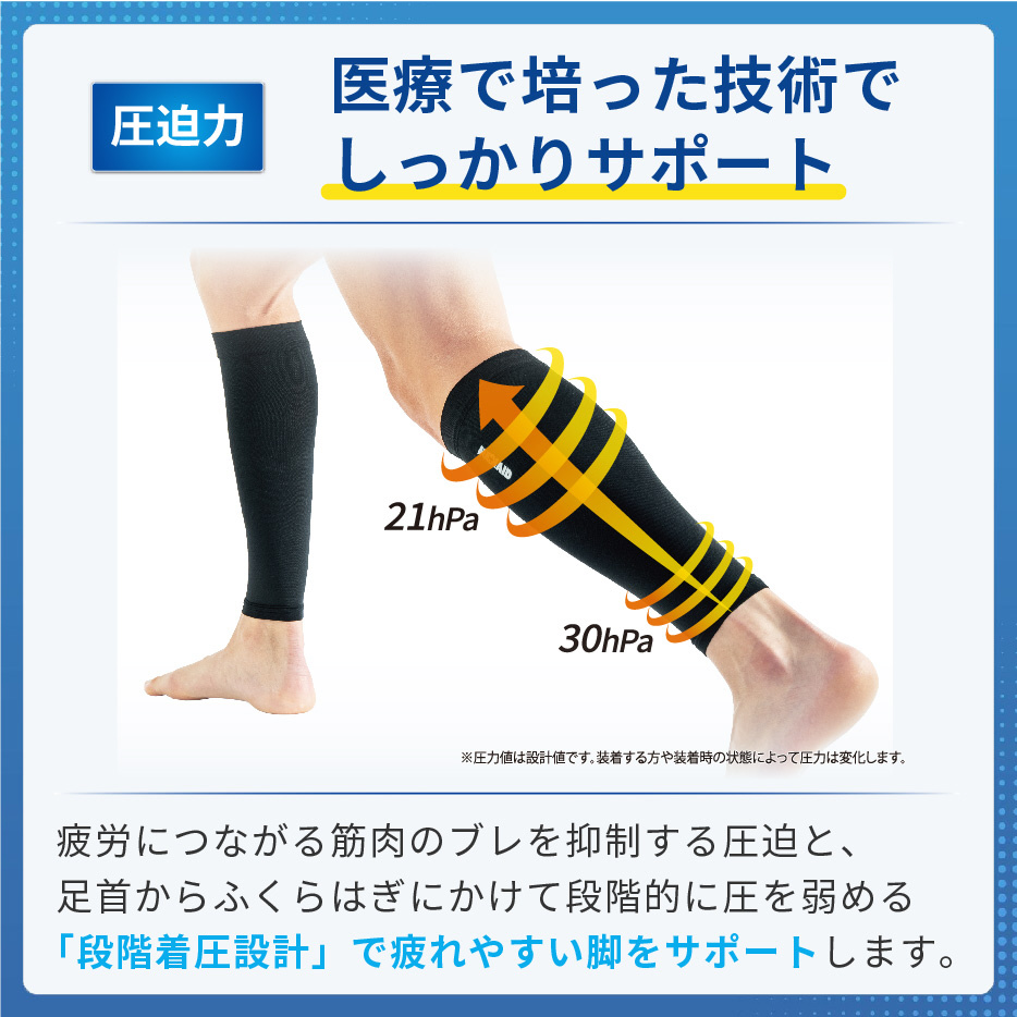 疲労につながる筋肉のブレを抑制する圧迫と、足首からふくらはぎにかけて段階的に圧を弱める「段階着圧設計」で疲れやすい脚をサポートします。