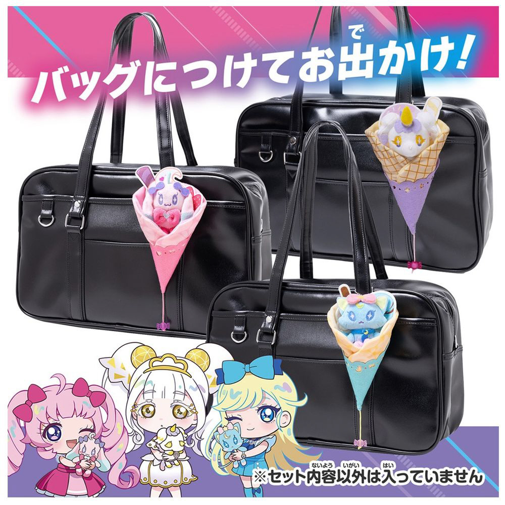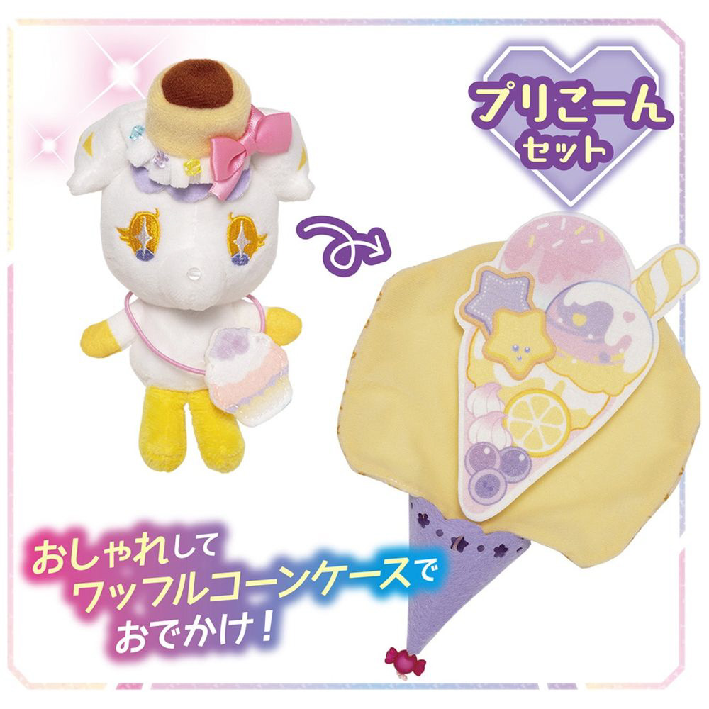 てのひらサイズのプリこーんぬいぐるみ、おしゃれ小物2つ、ワッフルコーンケース、スイーツシートがセットになっています。