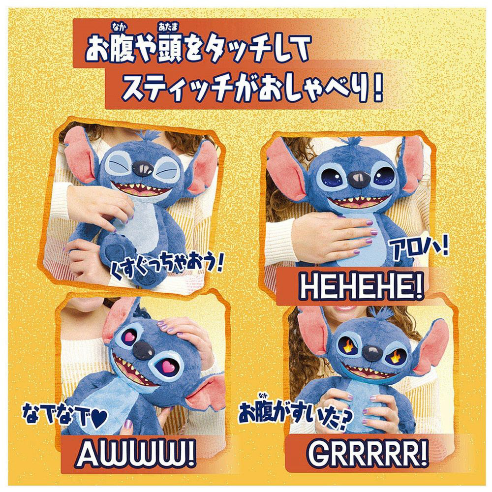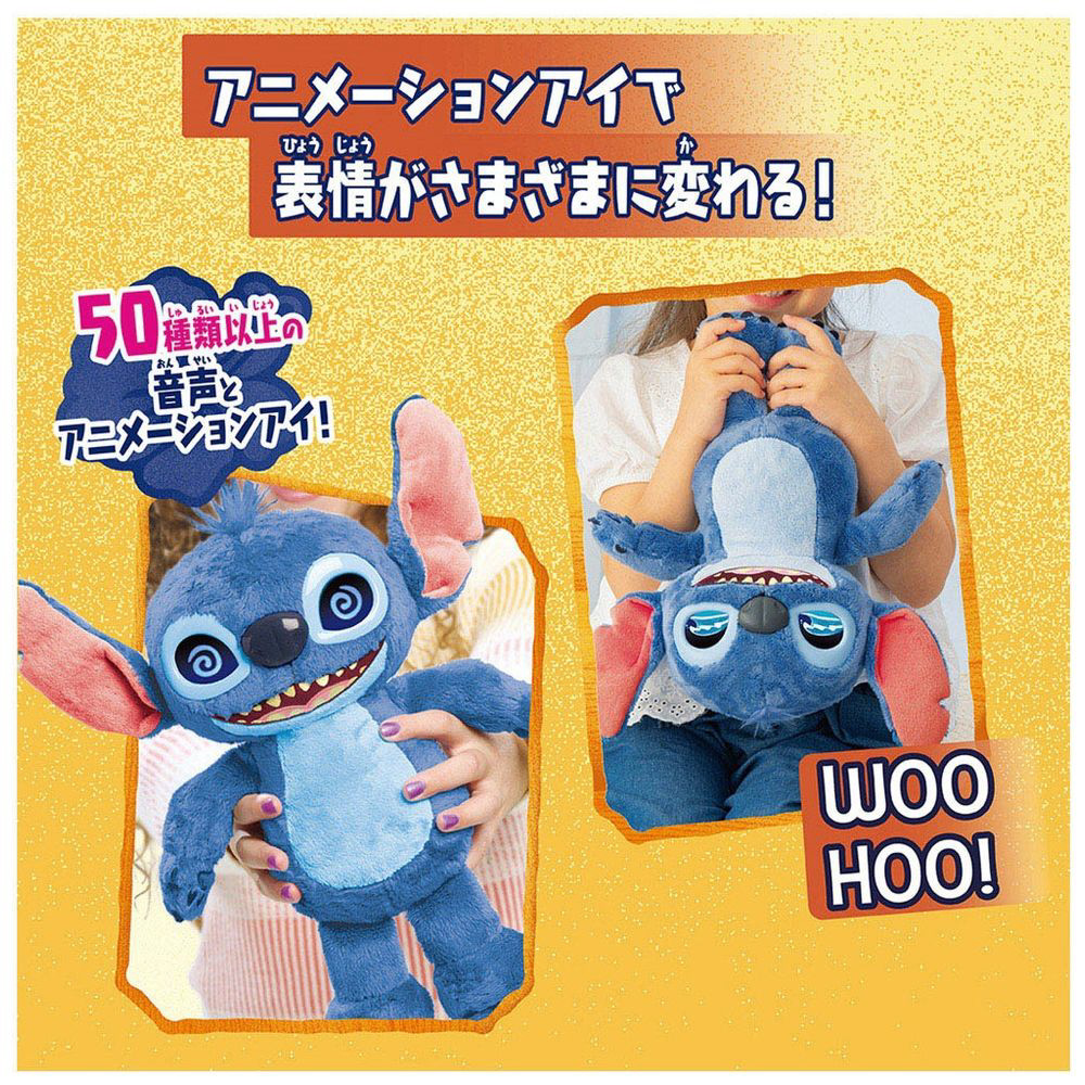 ■おなかと頭のタッチセンサーと、揺らしたり逆さにするなどの動きに反応して、 LCD(液晶)のアニメーションアイやおしゃべりでスティッチがこたえてくれる!