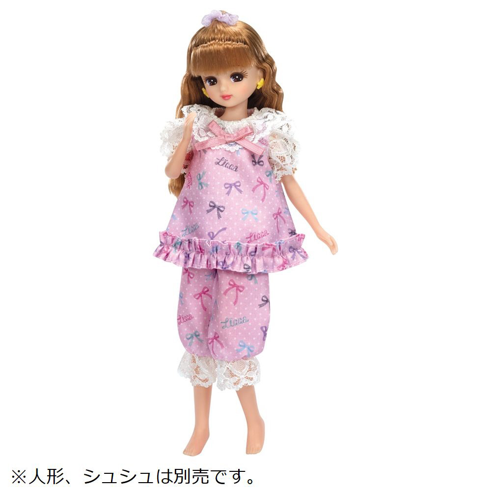 白のフリフリレースがかわいいリボン柄のパジャマと、リボンの付いたかわいいうさちゃんのぬいぐるみがついたドレスセットです。