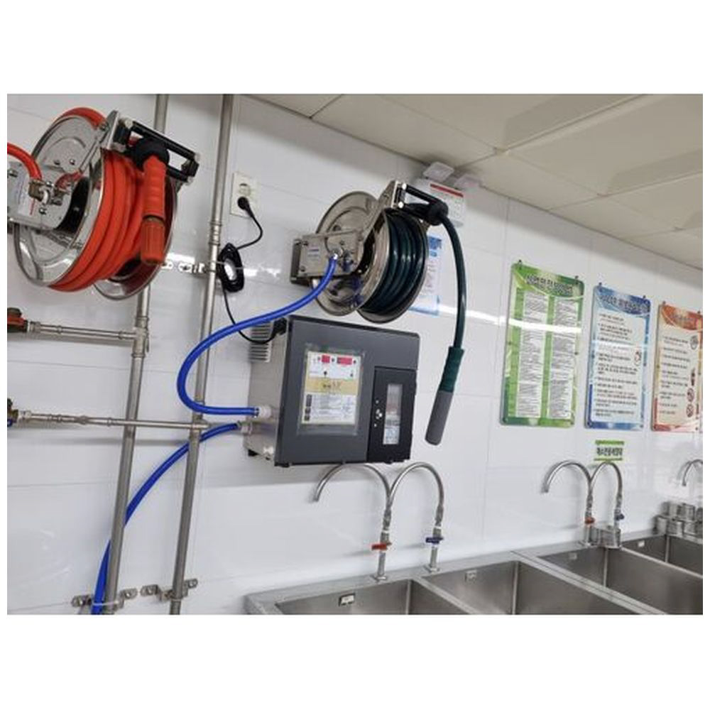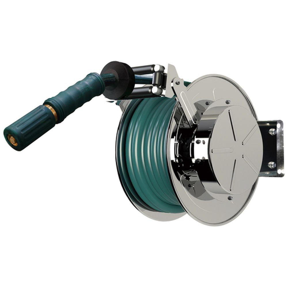 ステンレス仕様の水・温水用スプリング式自動巻ホースリールです。