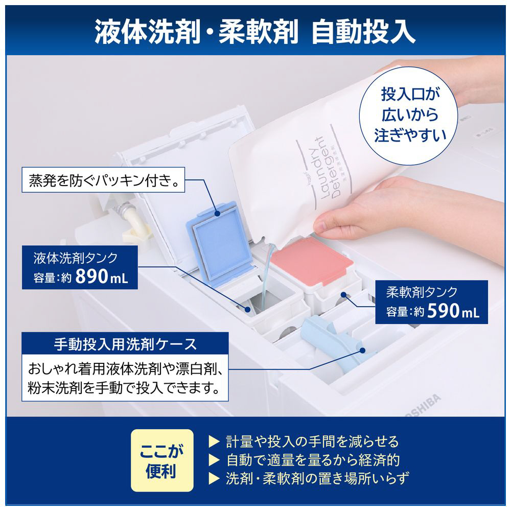 洗剤を量る手間がなくなり、使いすぎも防ぐ。ボタンを押すだけで洗濯スタート。洗剤・柔軟剤の置き場所も必要ありません。