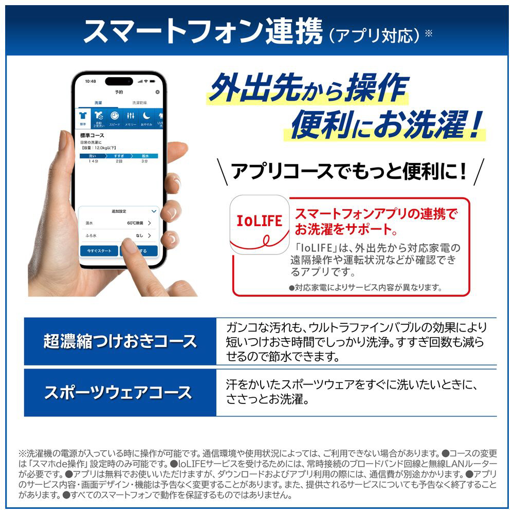 スマートフォンアプリでお洗濯の効率をアップ。外出先からの操作で、お洗濯をもっと便利に。