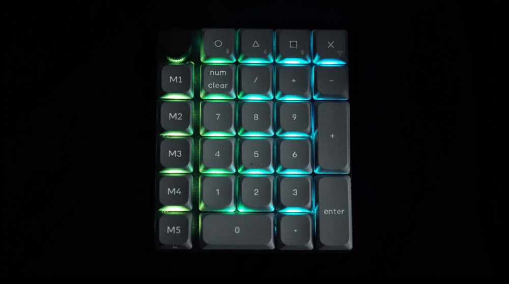 Keychron K0 Maxは、左側にマクロキー列とロータリーエンコーダーノブを備えた、ロープロファイル仕様のカスタムテンキーです。 単体の数字入力用テンキーとしても、QMK対応による幅広いカスタマイズが可能なキーセットとしても活用できます。