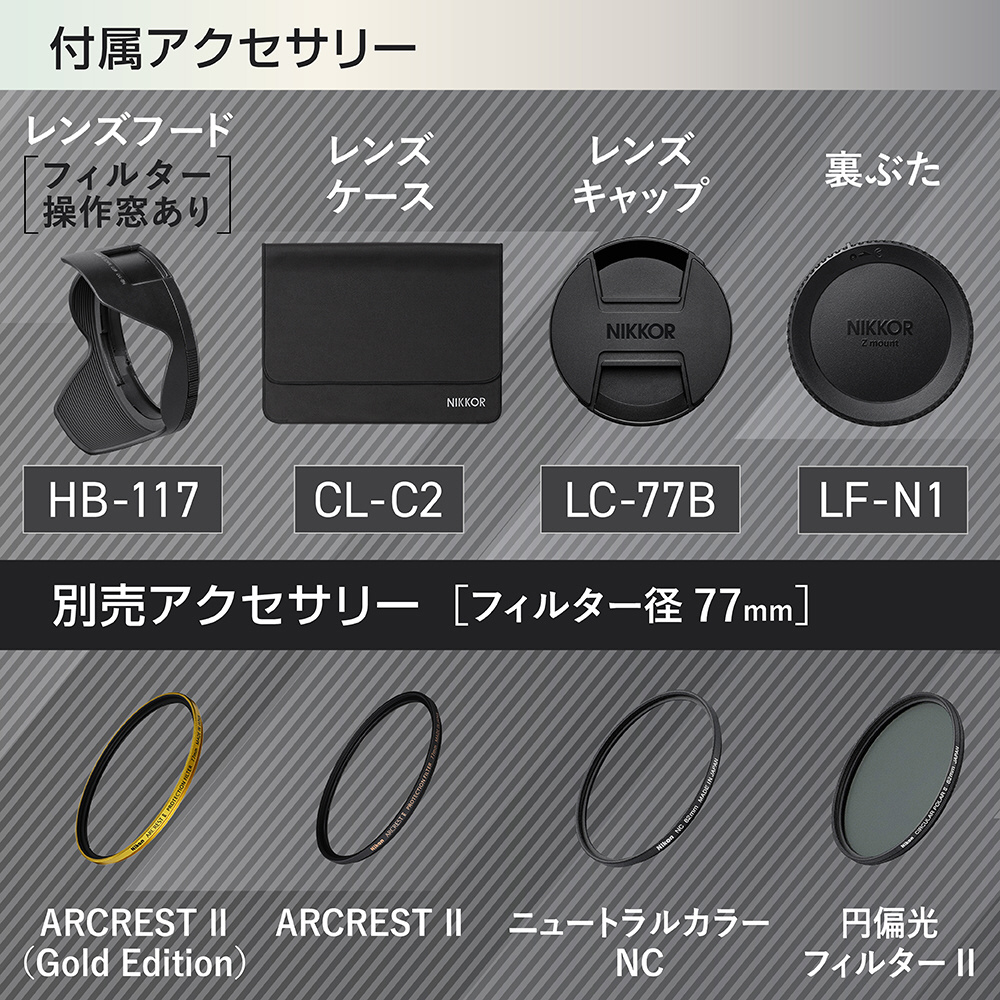 レンズキャップ77mm LC-77B(スプリング式)、裏ぶた LF-N1、レンズフード HB-117、レンズケース CL-C2