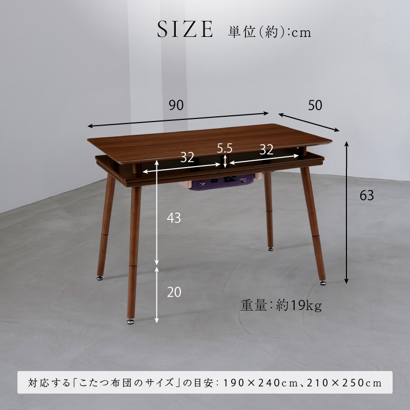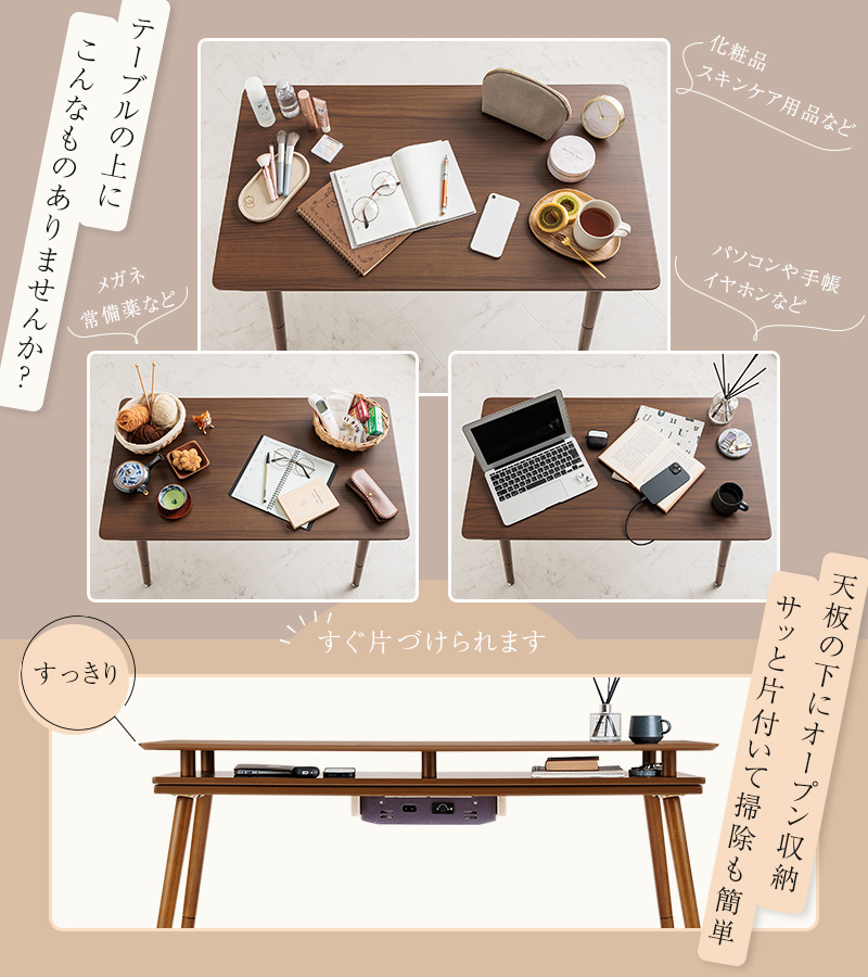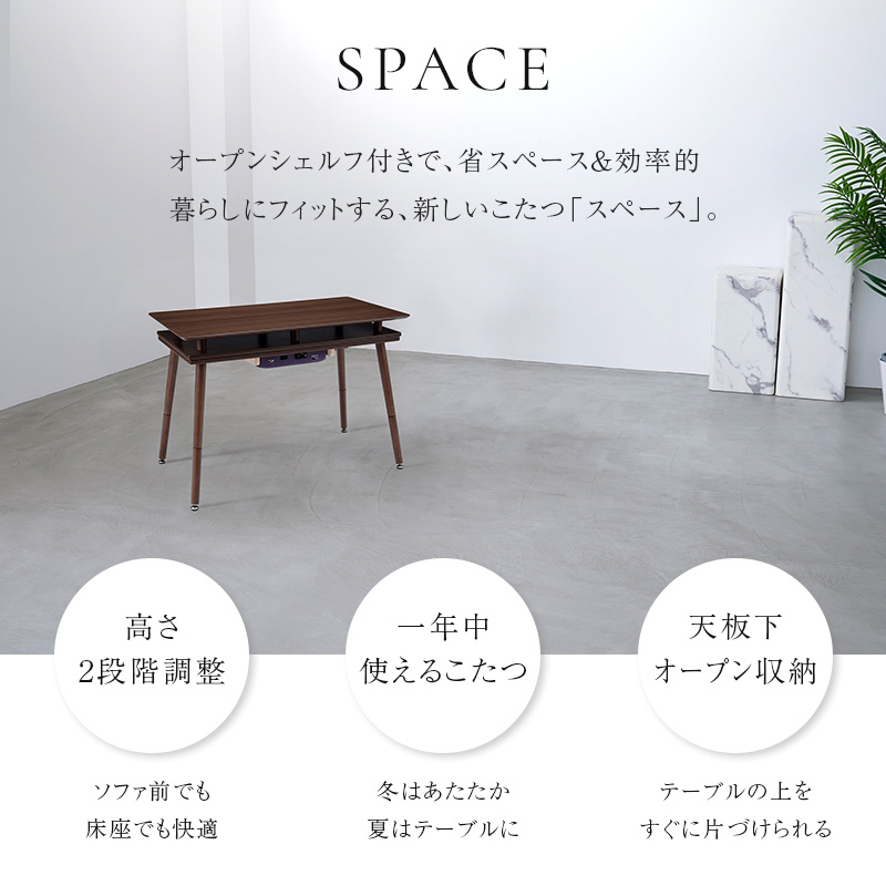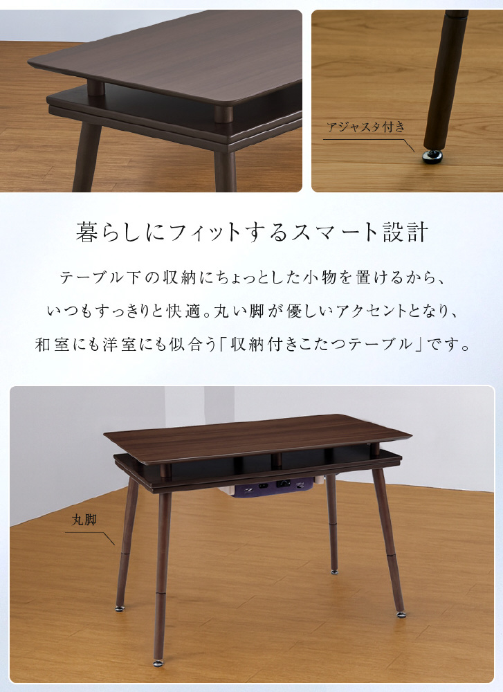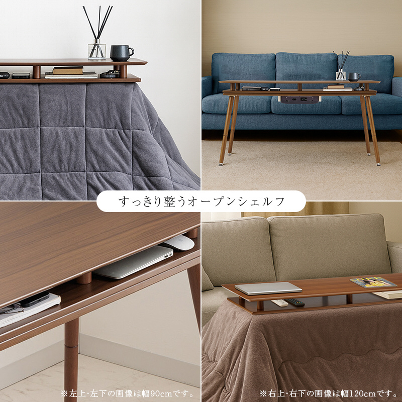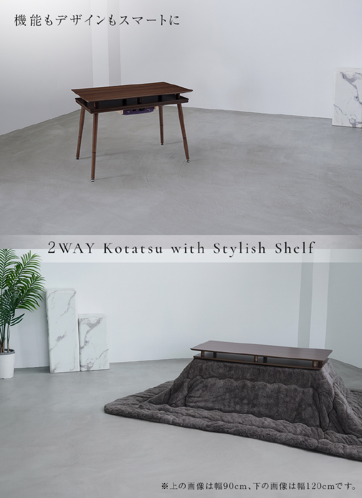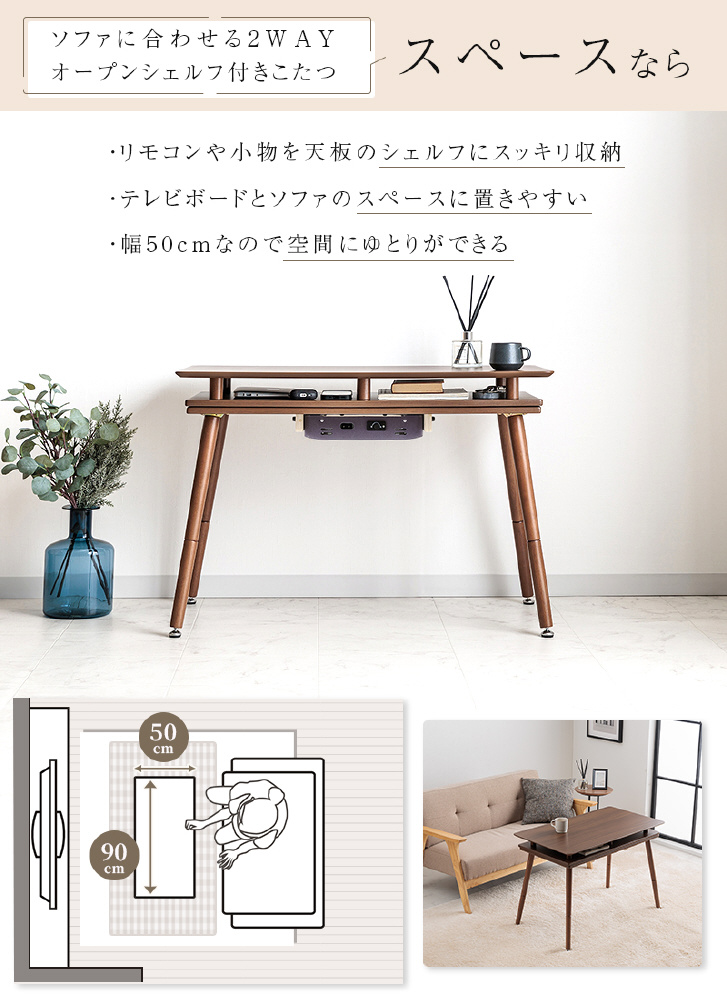 シェルフ付き 2Wayこたつテーブル 長方形 90×50cm オープンシェルフ ハイタイプ ロータイプ