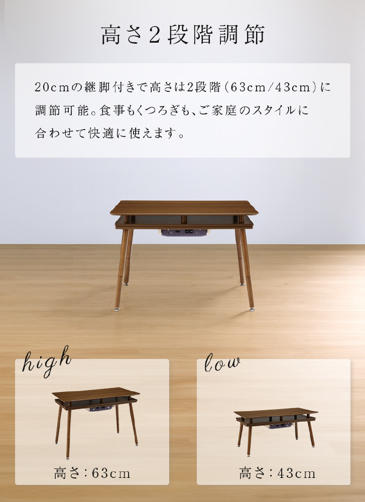 ■継脚付でこたつの高さを43/63cmの2段階に調節可能