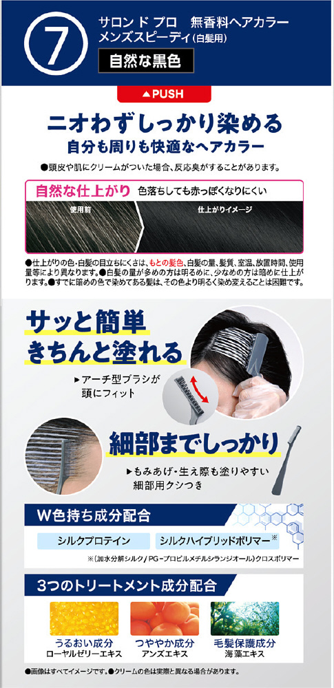 無香料の男性白髪用ヘアカラー。放置時間5分でスピーディ&ムラなくきれいに染めます。