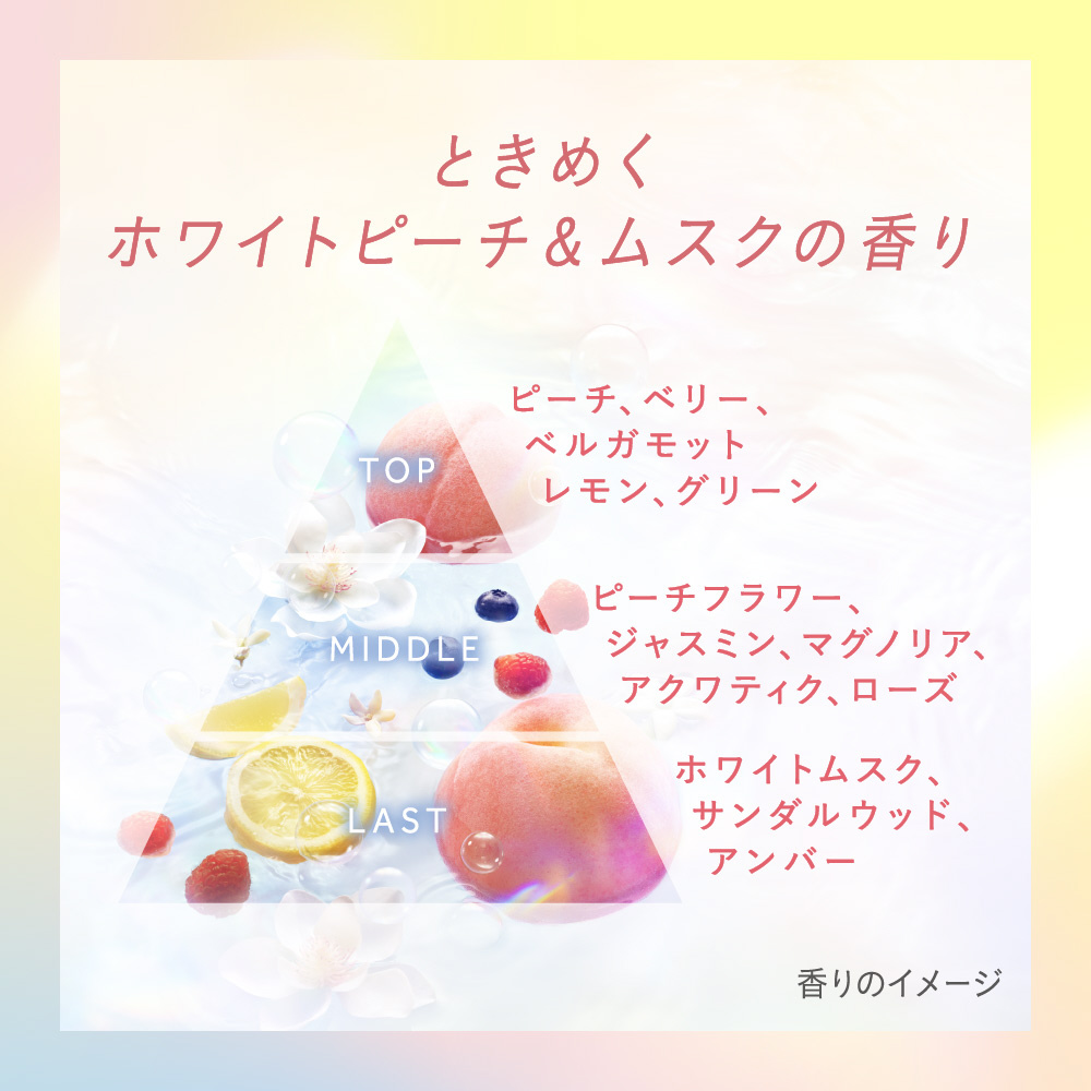 パサつく髪に。とろふわスフレ泡でやさしく洗う。翌朝するん!日中もさらっとツヤ髪つづく。●厳選した美容液成分うるりドロップ配合(保湿)(スクワラン、シアバター、加水分解コラーゲン、ヒアルロン酸Na、ローヤルゼリーエキス、ラウロイル加水分解シルクNa、ポリクオタニウムー52)●アミノ酸系洗浄成分使用●サルフェートフリー処方●ときめくホワイトピーチ&ムスクの香り