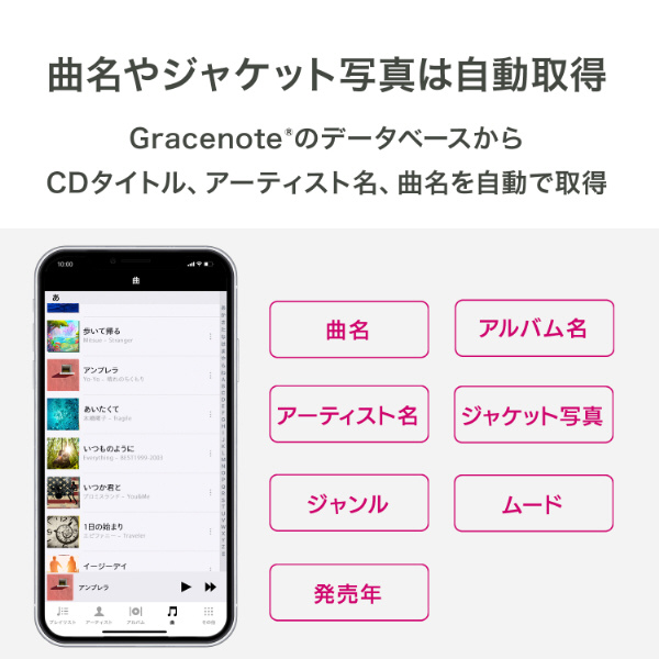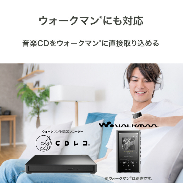 iPhoneやAndroidスマホ、ウォークマン(R)に音楽CDの曲を入れられるスマホ用CDレコーダーです。取り込みはCDレコ6とスマホをワイヤレスでつなぎ、「CDレコミュージック」アプリで操作するだけ。