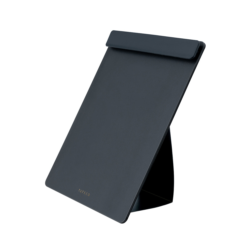 “立てて使えるクリップボード” ワンステップで自立する、スタンド機能付きのクリップボードです。自宅や職場の限られた机上スペースの有効活用ができ、また、PCと同じ目線で入力作業ができるため書類の確認がしやすく、作業効率も高まります。A4コピー用紙最大30枚収納可能です。