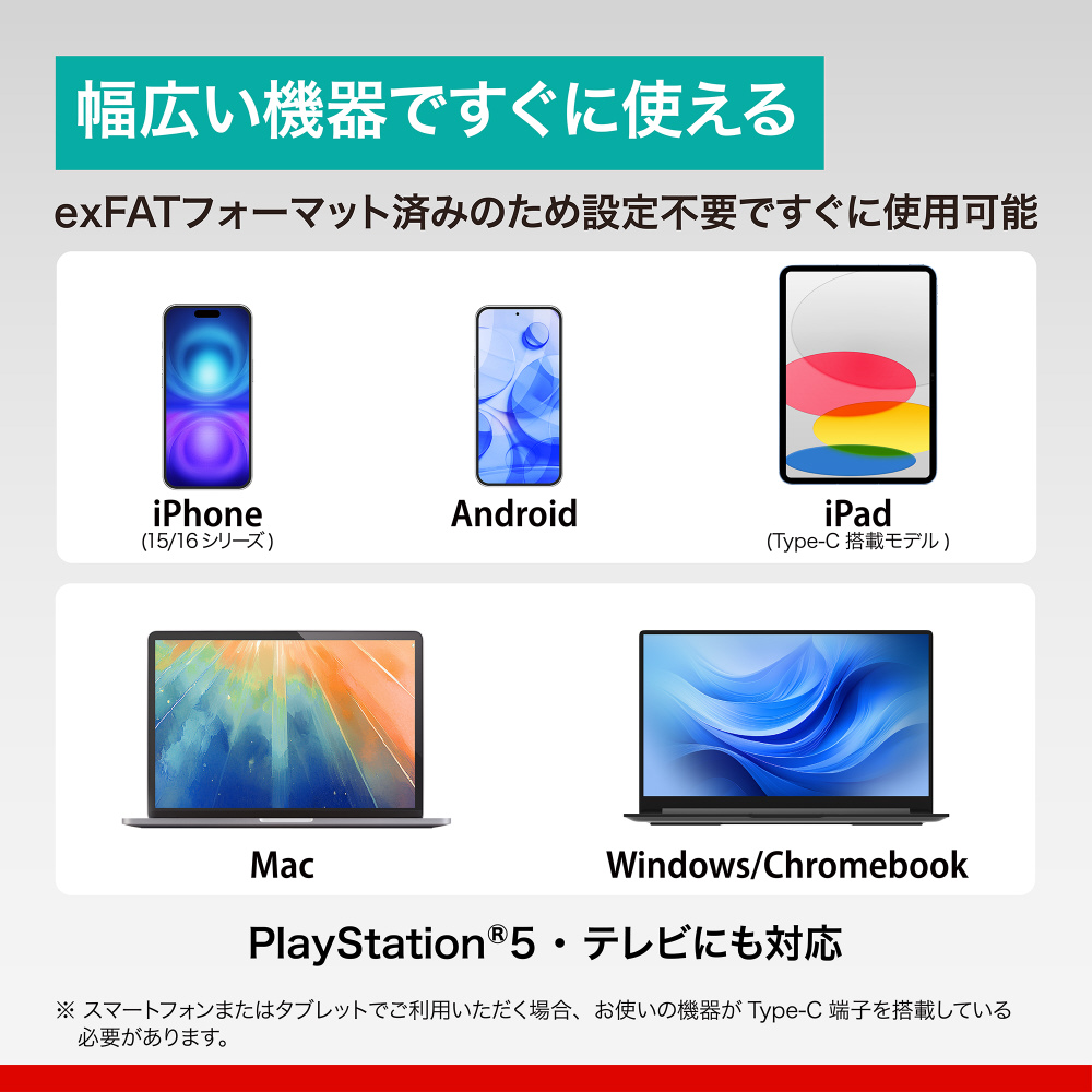パソコンだけでなく、スマホやタブレット等さまざまな機器で、フォーマットや変換アダプター無しでそのまま使用できます。
