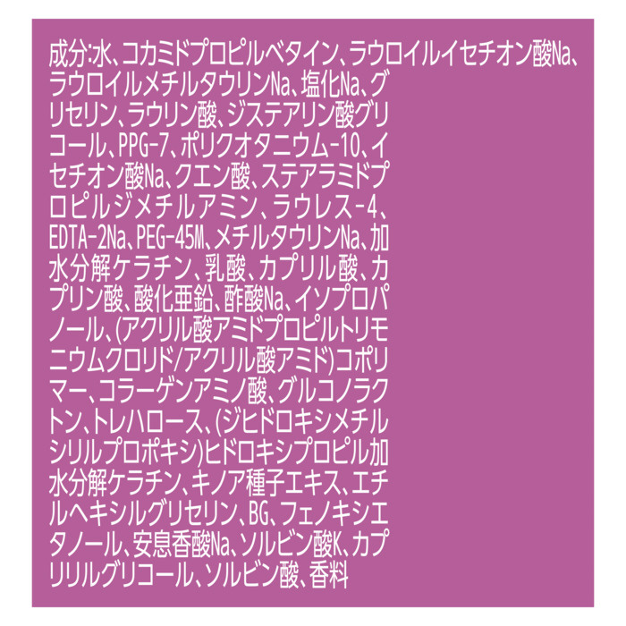 水、コカミドプロピルベタイン、ラウロイルイセチオン酸Na、ラウロイルメチルタウリンNa、塩化Na、グリセリン、ラウリン酸、ジステアリン酸グリコール、PPG-7、ポリクオタニウム-10、イセチオン酸Na、クエン酸、ステアラミドプロピルジメチルアミン、ラウレス-4、EDTA-2Na、PEG-45M、メチルタウリンNa、加水分解ケラチン、乳酸、カプリル酸、カプリン酸、酸化亜鉛、酢酸Na、イソプロパノール、(アクリル酸アミドプロピルトリモニウムクロリド/アクリル酸アミド)コポリマー、コラーゲンアミノ酸、グルコノラクトン、トレハロース、(ジヒドロキシメチルシリルプロポキシ)ヒドロキシプロピル加水分解ケラチン、キノア種子エキス、エチルヘキシルグリセリン、BG、フェノキシエタノール、安息香酸Na、ソルビン酸K、カプリリルグリコール、ソルビン酸、香料