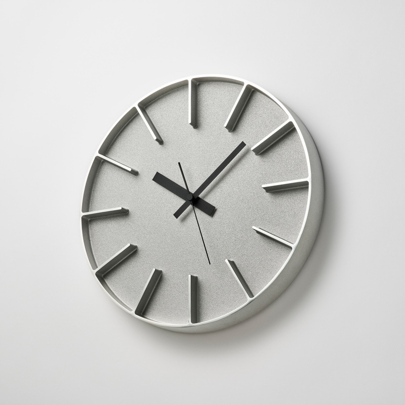 AZUMI によるアルミニウムクロック。アルミ一体成型の豊かな品質とシンプルで力強いデザインが特徴です。アルミの素材感と丁寧に磨き上げられたインデックスが美しく融合され、シャープな印象を与えます。