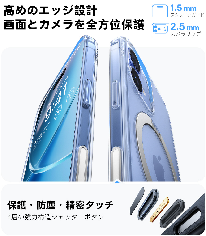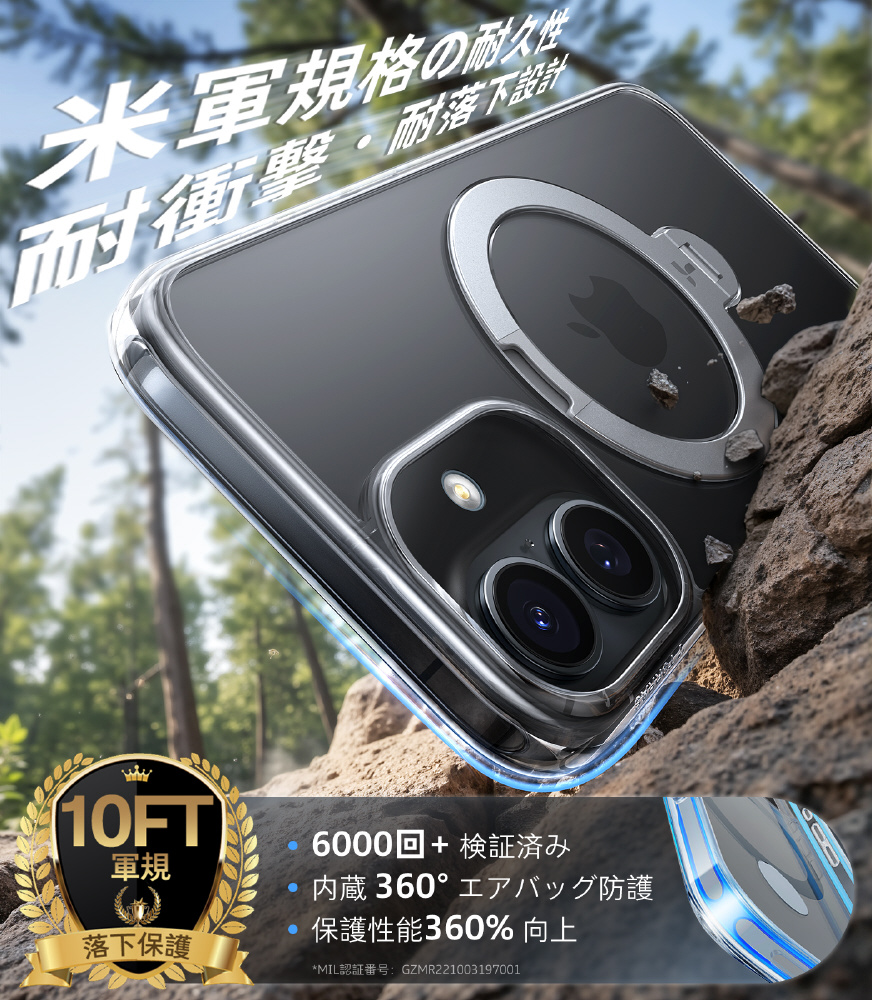 ・2.44m落下防止性能:フレーム部分の強化保護デザインで2倍のMIL耐衝撃性能