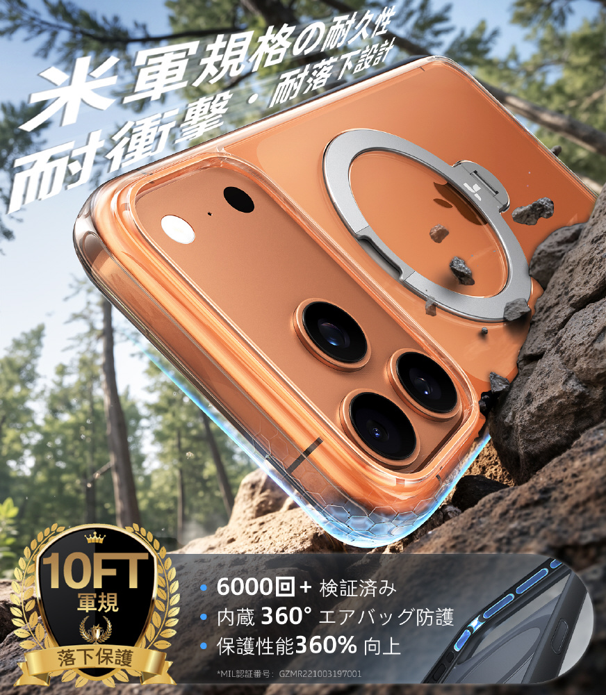 ・2.44m落下防止性能:フレーム部分の強化保護デザインで2倍のMIL耐衝撃性能
