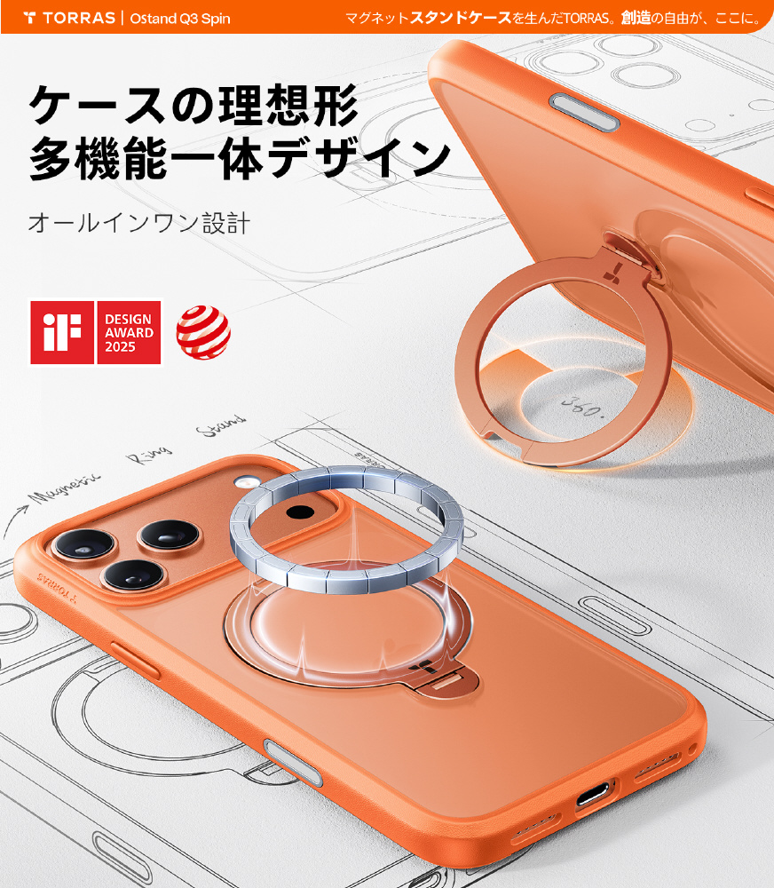 Ostand Q3 Spinは360°回転スタンドを搭載し、縦横自在なスタイルで使用可能。MagSafe対応で、使い勝手とデザイン性を両立した新感覚ケースです。