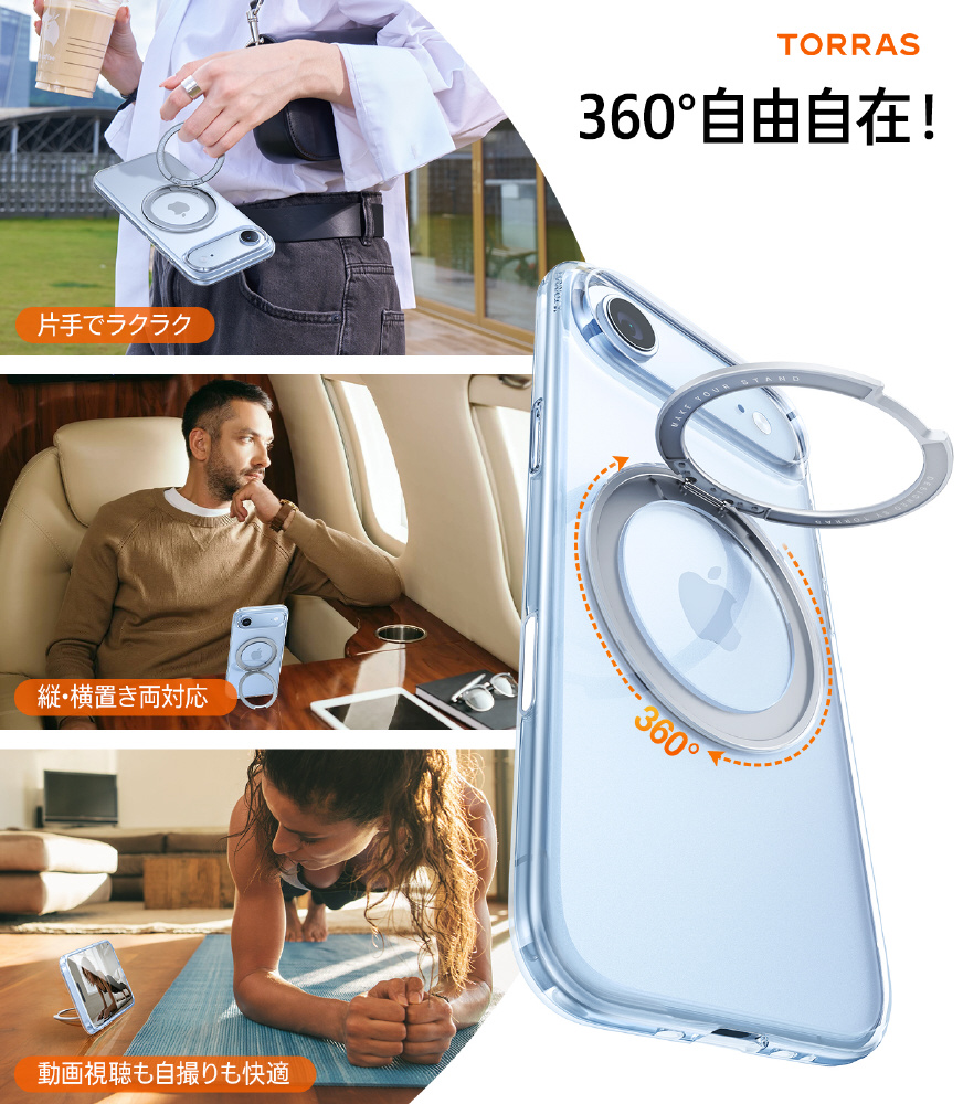 ・360°回転可能なリングスタンドによって、あらゆる角度に調節でき、映画鑑賞、テレビ電話、勉強、撮影など様々な利用シーンに対応。