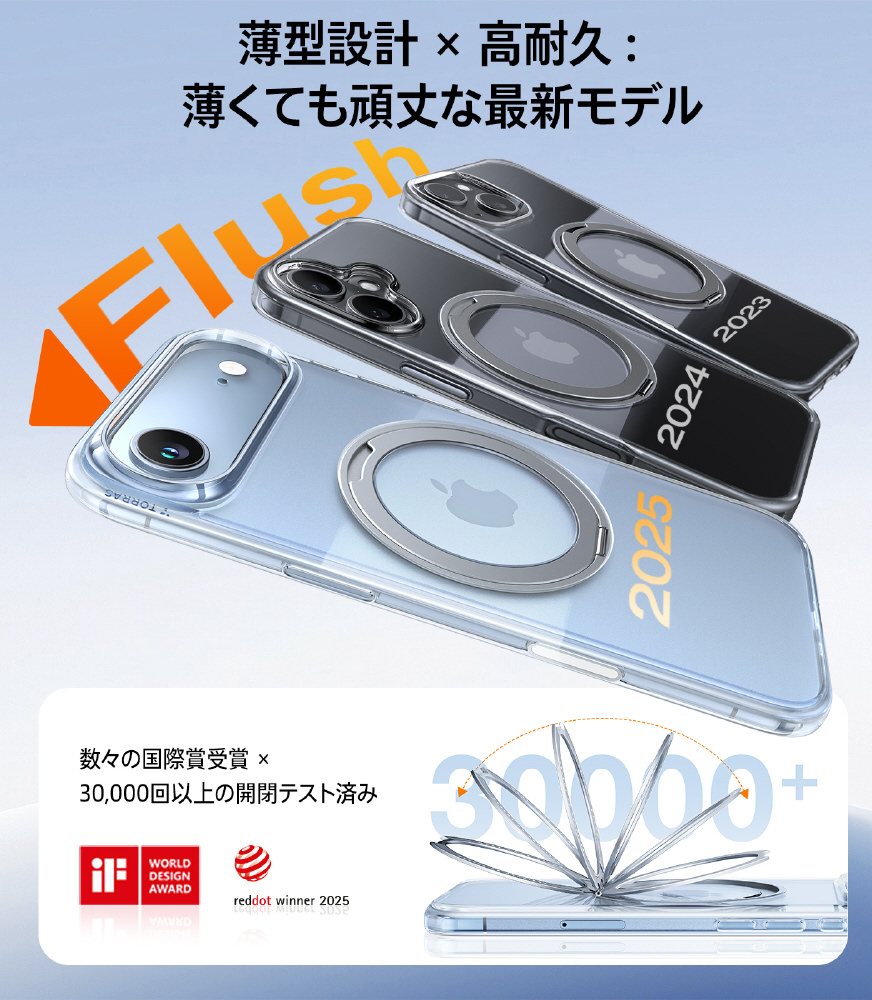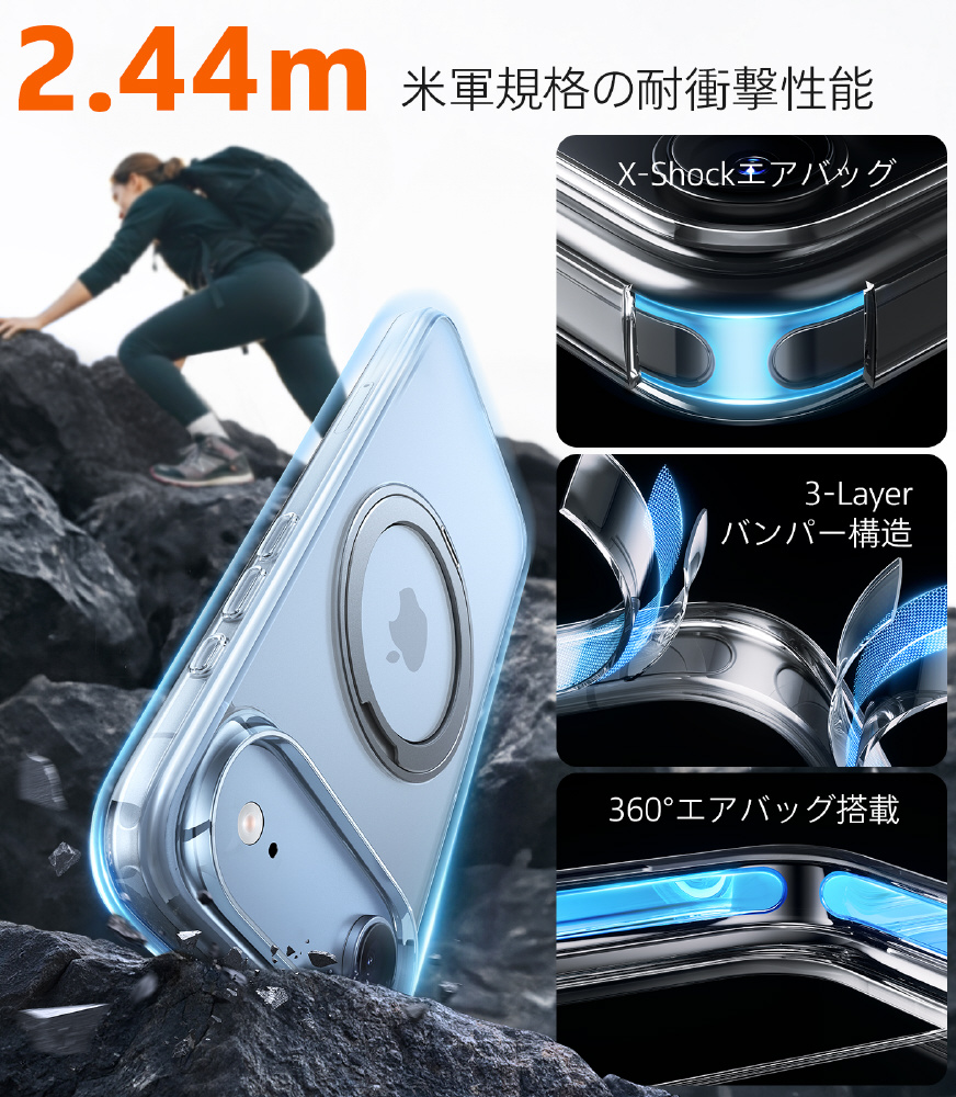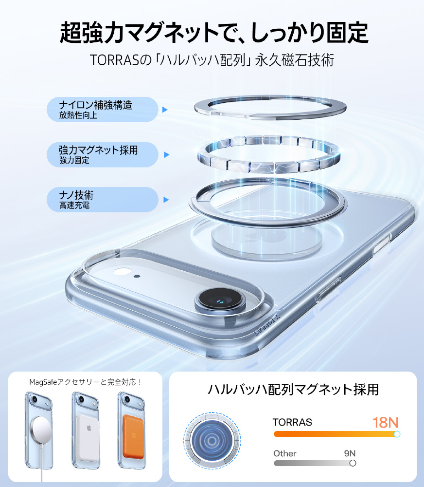 ・TORRAS独自の「Halbach」マグネット技術で、N52マグネットブラケット38個が内蔵され、磁力は18N、MagSafeアクセサリーに対応。