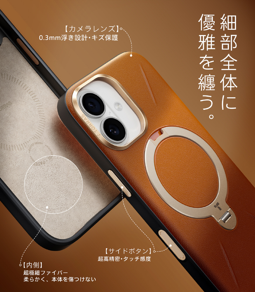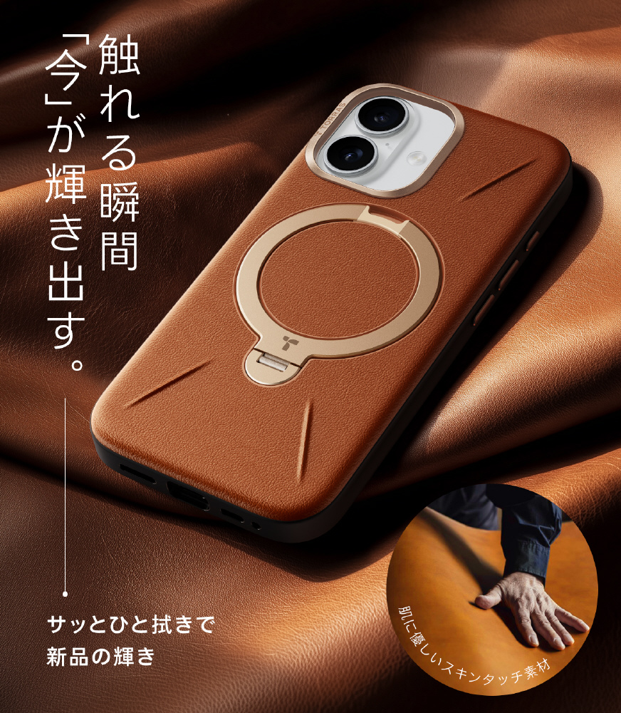 レザー調の上品な質感と360°回転スタンドを融合したQ3レザートーン。ビジネスでもプライベートでも映える、大人のための高機能ケースです。