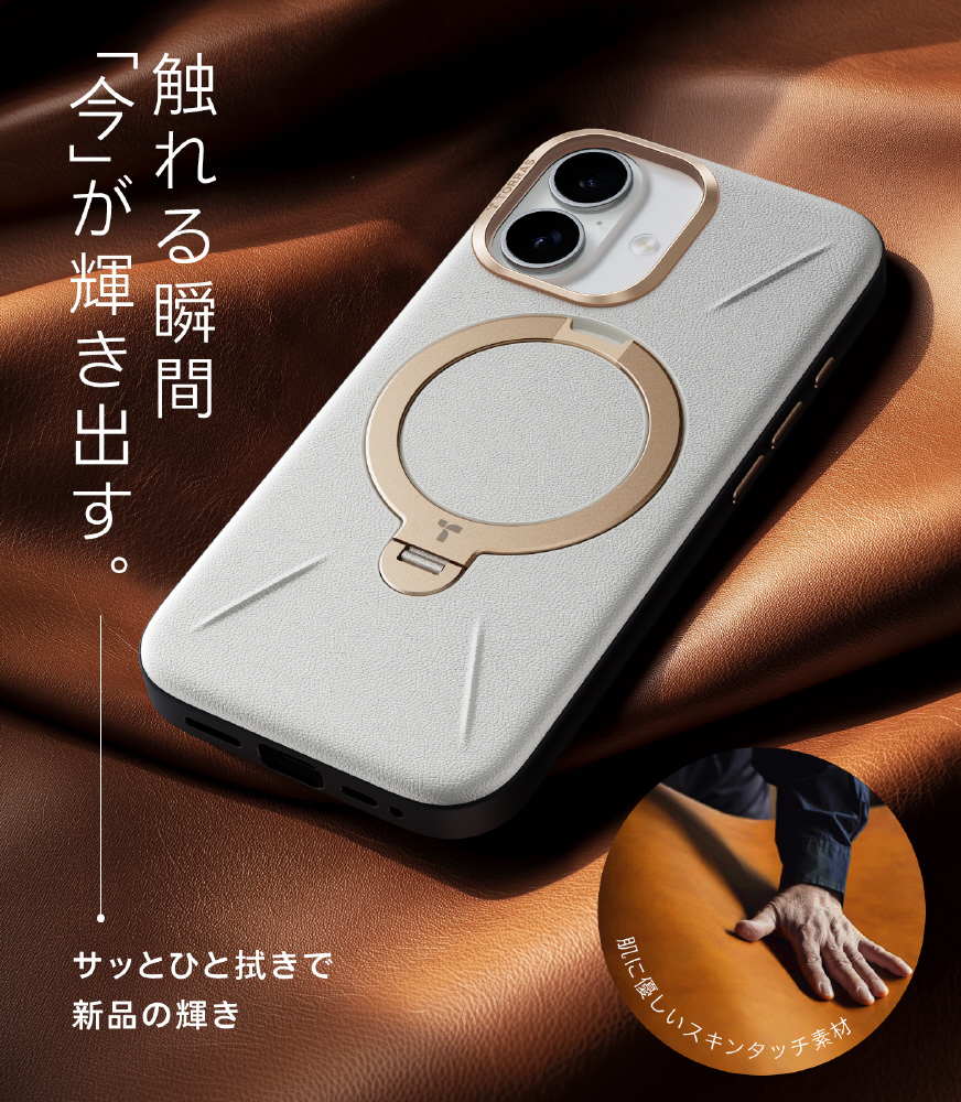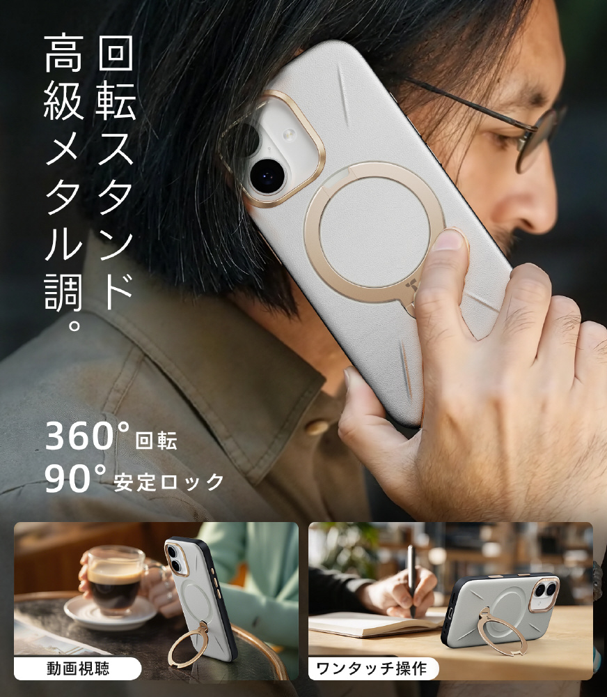 レザー調の上品な質感と360°回転スタンドを融合したQ3レザートーン。ビジネスでもプライベートでも映える、大人のための高機能ケースです。