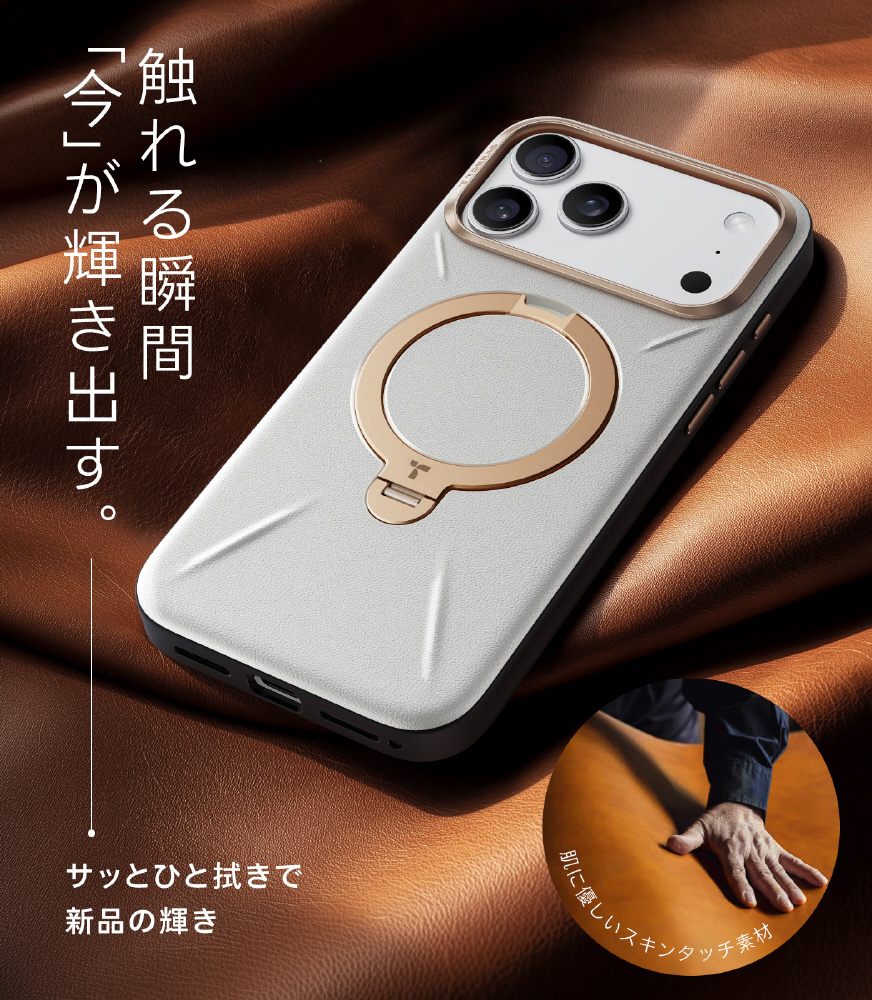 レザー調の上品な質感と360°回転スタンドを融合したQ3レザートーン。ビジネスでもプライベートでも映える、大人のための高機能ケースです。
