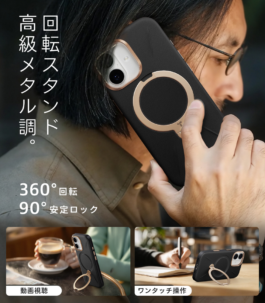 レザー調の上品な質感と360°回転スタンドを融合したQ3レザートーン。ビジネスでもプライベートでも映える、大人のための高機能ケースです。