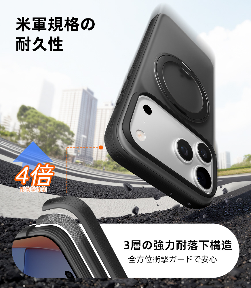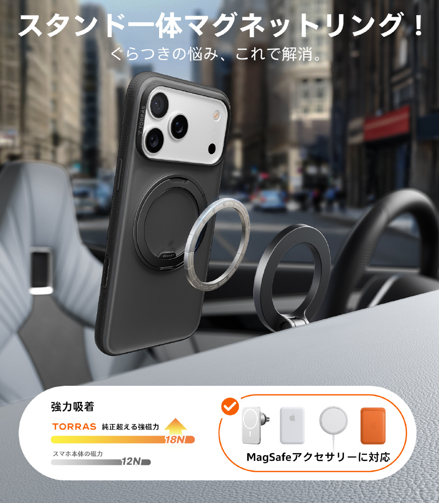 ・TORRAS独自の「Halbach」マグネット技術により、N52マグネットブラケット38個が内蔵され、MagSafeアクセサリーにしっかり吸着します。(Apple純正MagSafeケースの磁力(10N)の約1.7倍。)