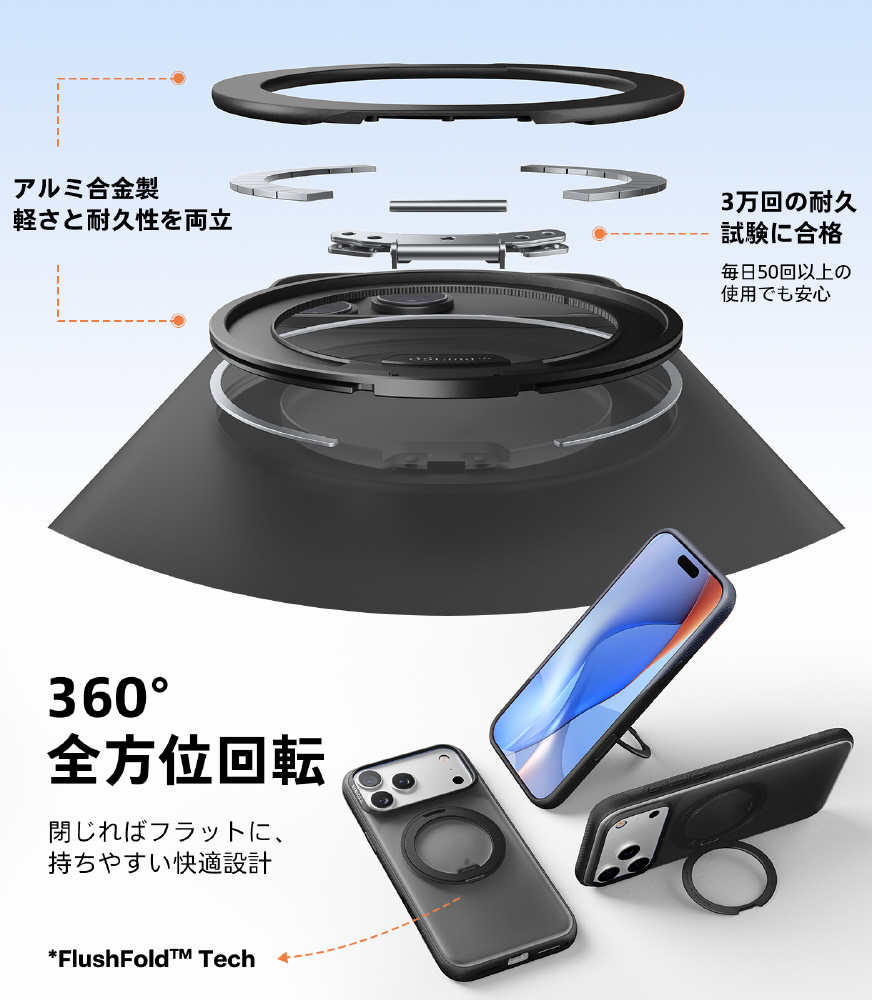 ・アップグレードされた360°回転式キックスタンドでお好きな角度でスマートフォンを支えることができます。
