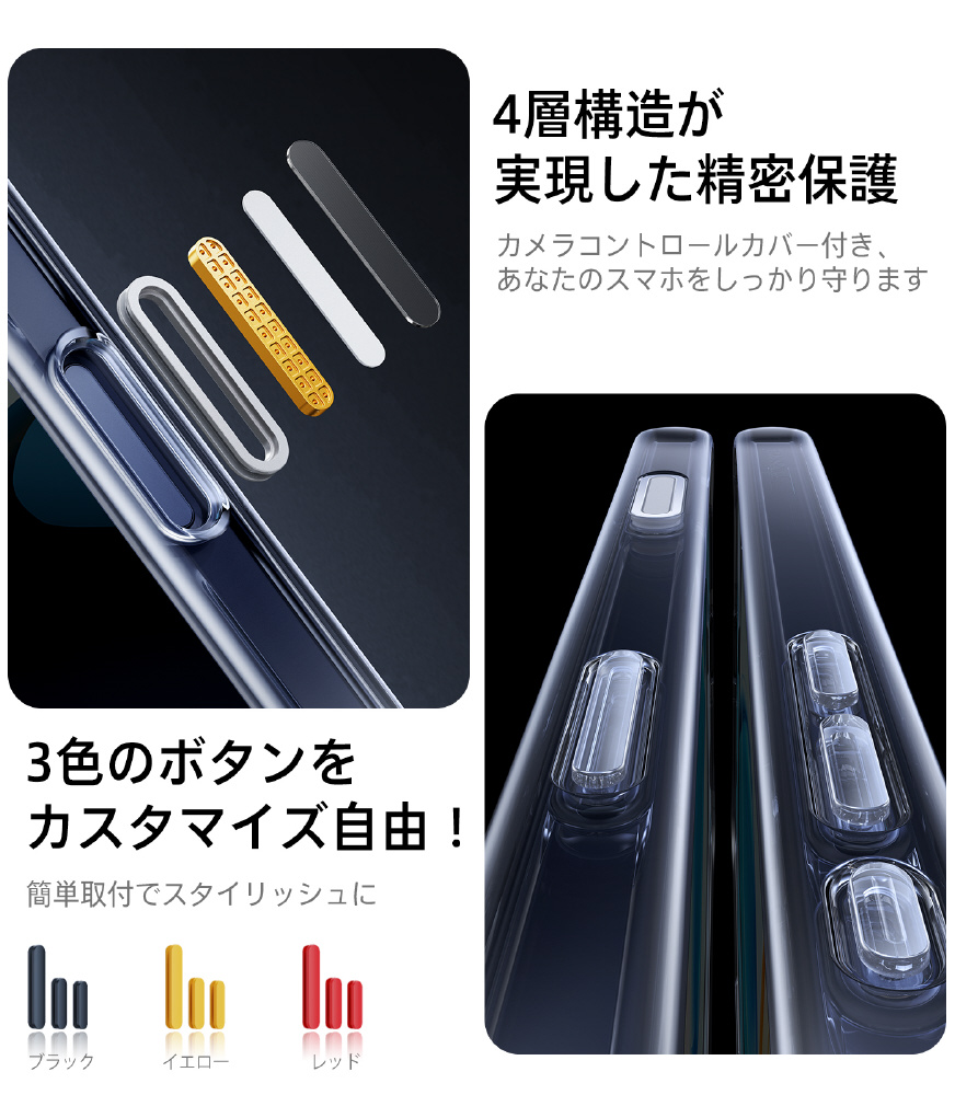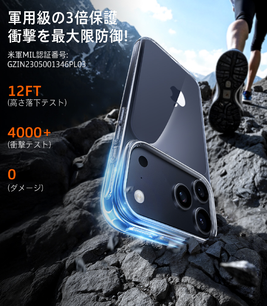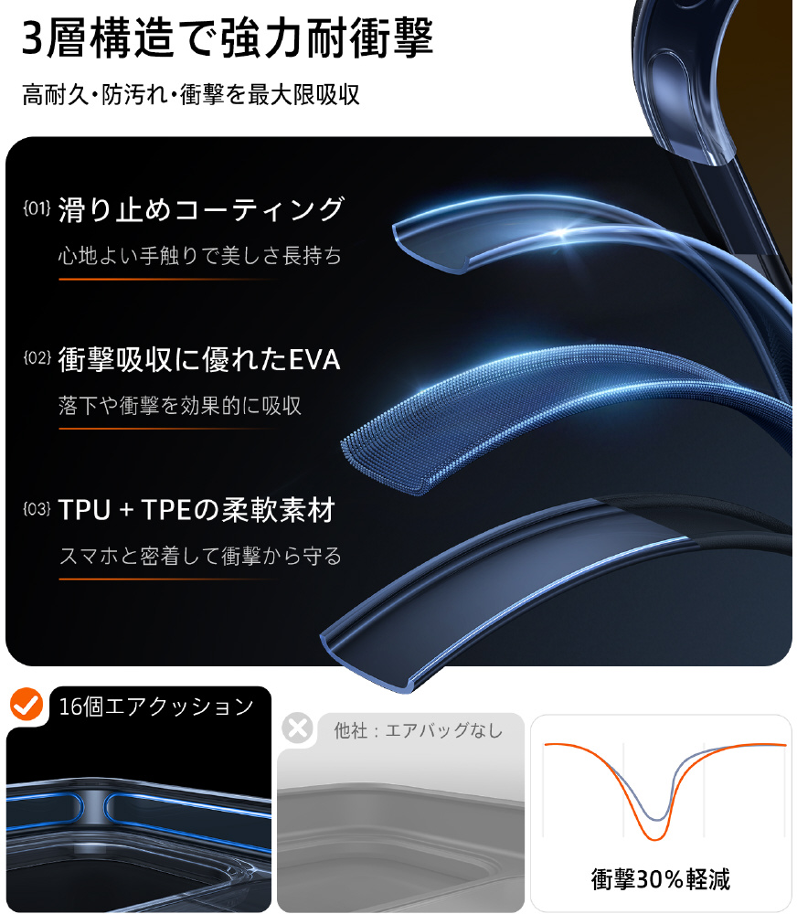・360°衝撃を吸収できるエアクッションのデザインのため、衝撃を受けやすい4隅から全方向にスマホとカメラをしっかり保護できます。