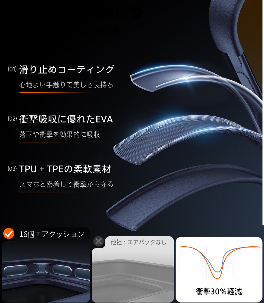・360°衝撃を吸収できるエアクッションのデザインのため、衝撃を受けやすい4隅から全方向にスマホとカメラをしっかり保護できます。