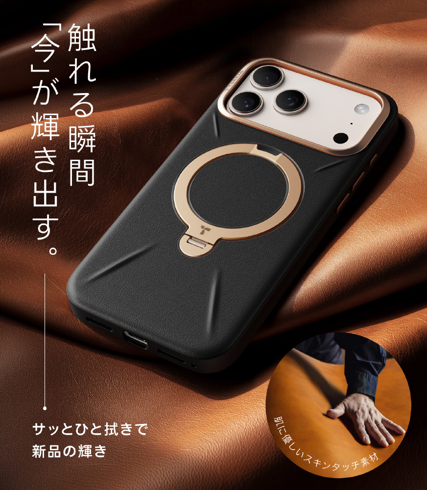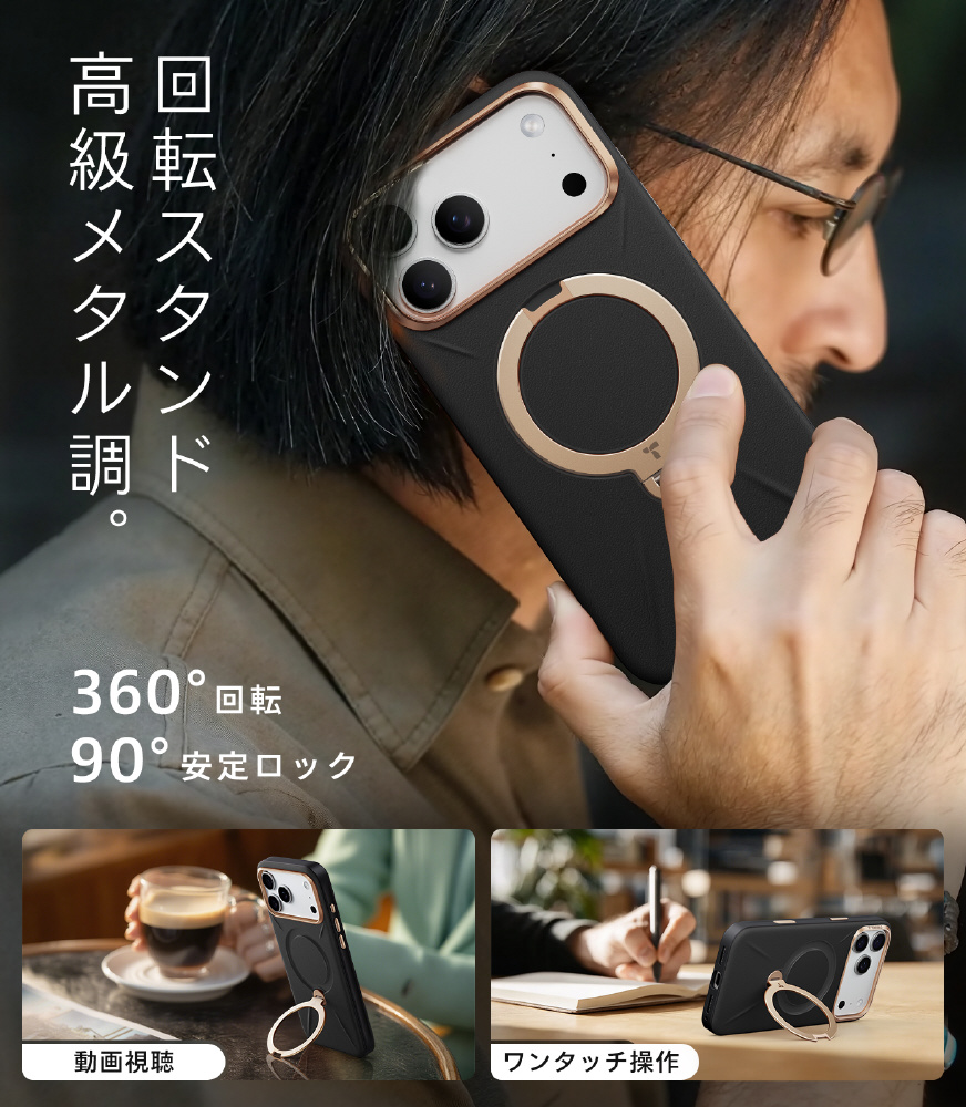 レザー調の上品な質感と360°回転スタンドを融合したQ3レザートーン。ビジネスでもプライベートでも映える、大人のための高機能ケースです。