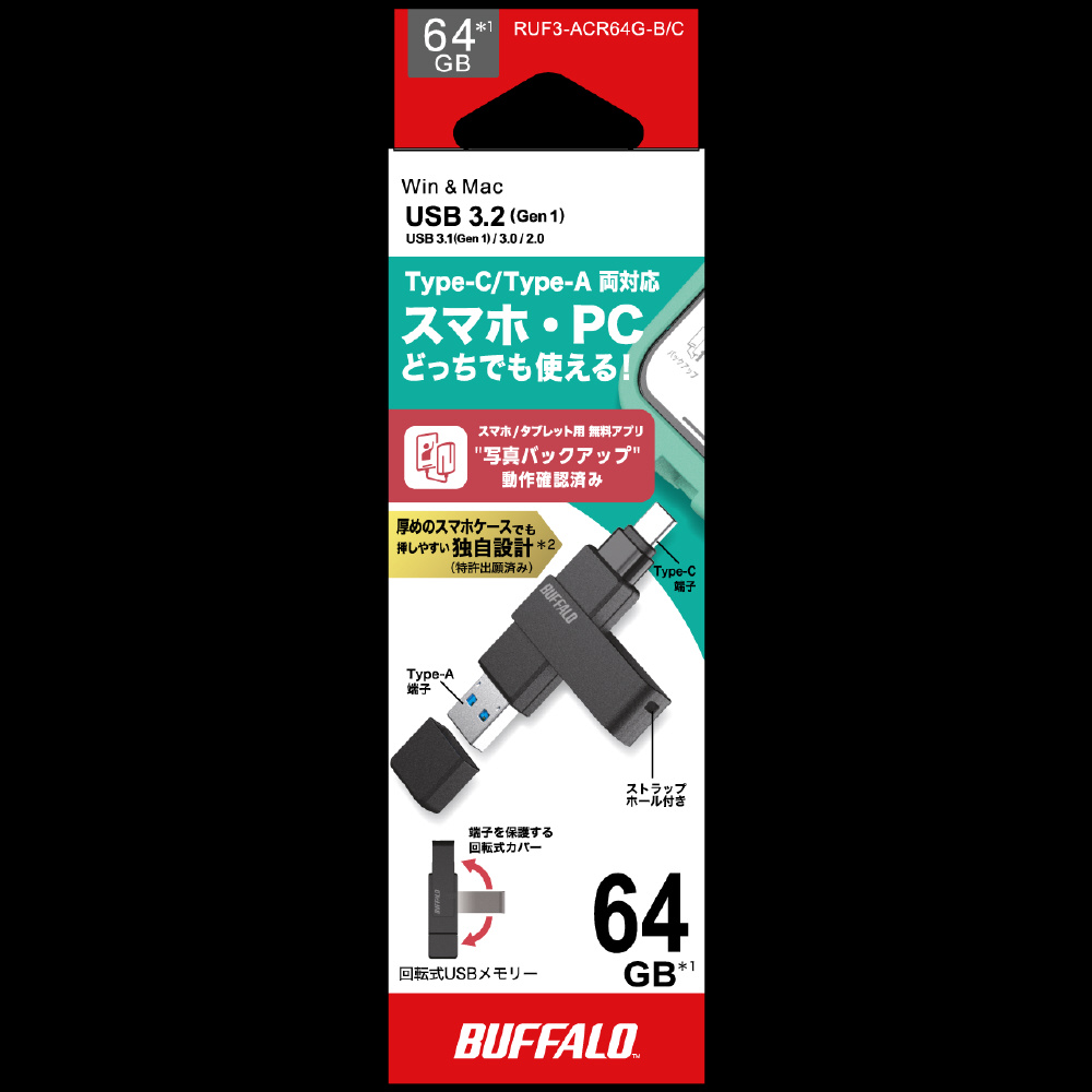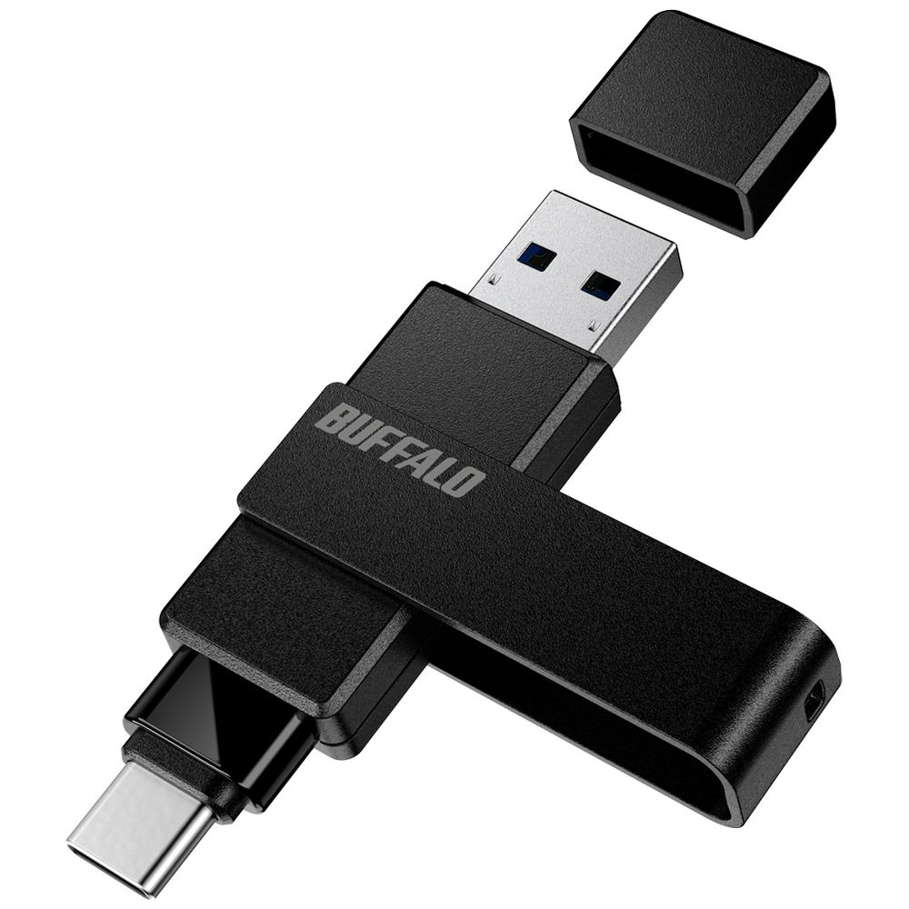 USBメモリ (Chrome/Android/iPadOS/iOS/Mac/Windows11対応) ブラック RUF3-ACR64G-B/C [64GB /USB TypeA+USB TypeC /USB3.2 /回転式]