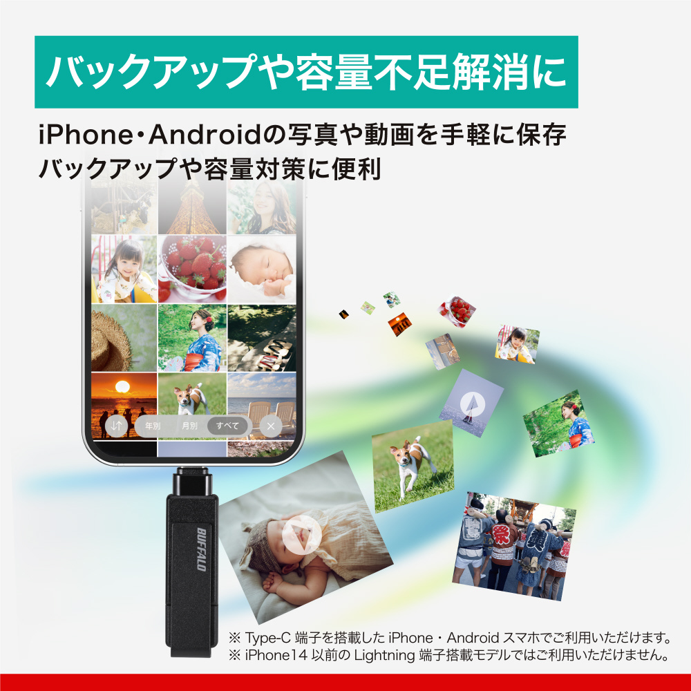 本商品は、バッファローアプリ「写真バックアップ」(無料)に対応。大切な思い出をもっと簡単に保存できます。