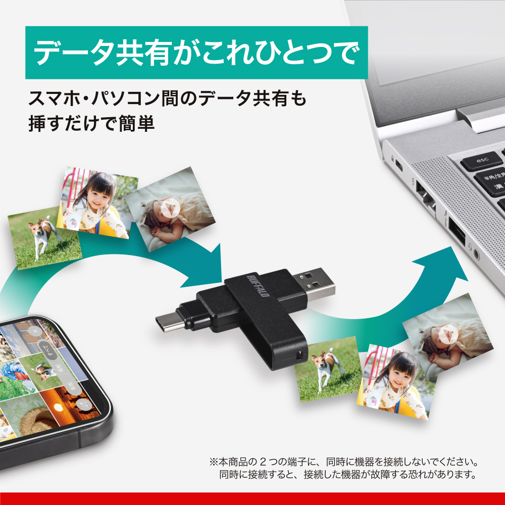 USB Type-C / Type-A両方の端子を備えているため、さまざまな機器に直接つなぐことができるUSBメモリーです。