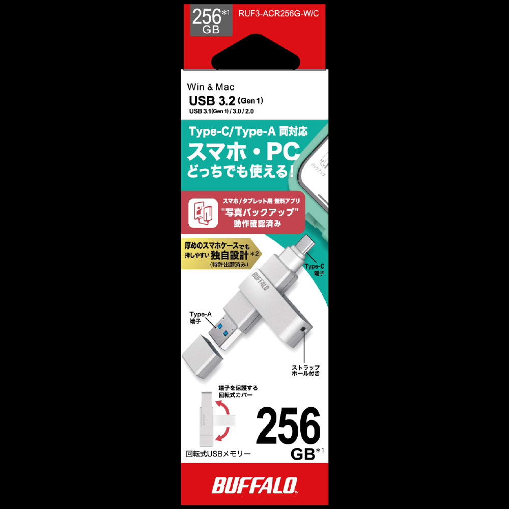 USBメモリ (Chrome/Android/iPadOS/iOS/Mac/Windows11対応) ホワイト RUF3-ACR256G-W/C [256GB /USB TypeA+USB TypeC /USB3.2 /回転式]