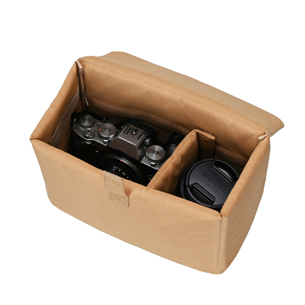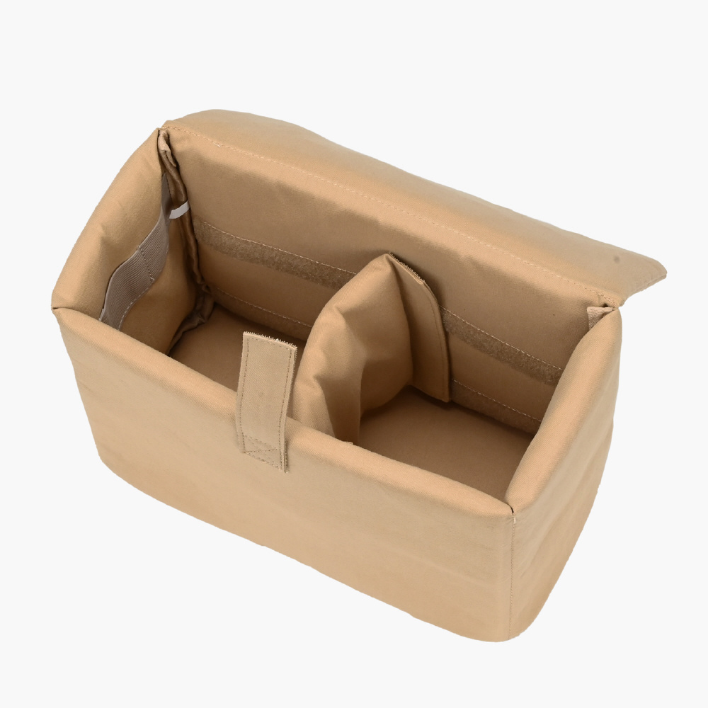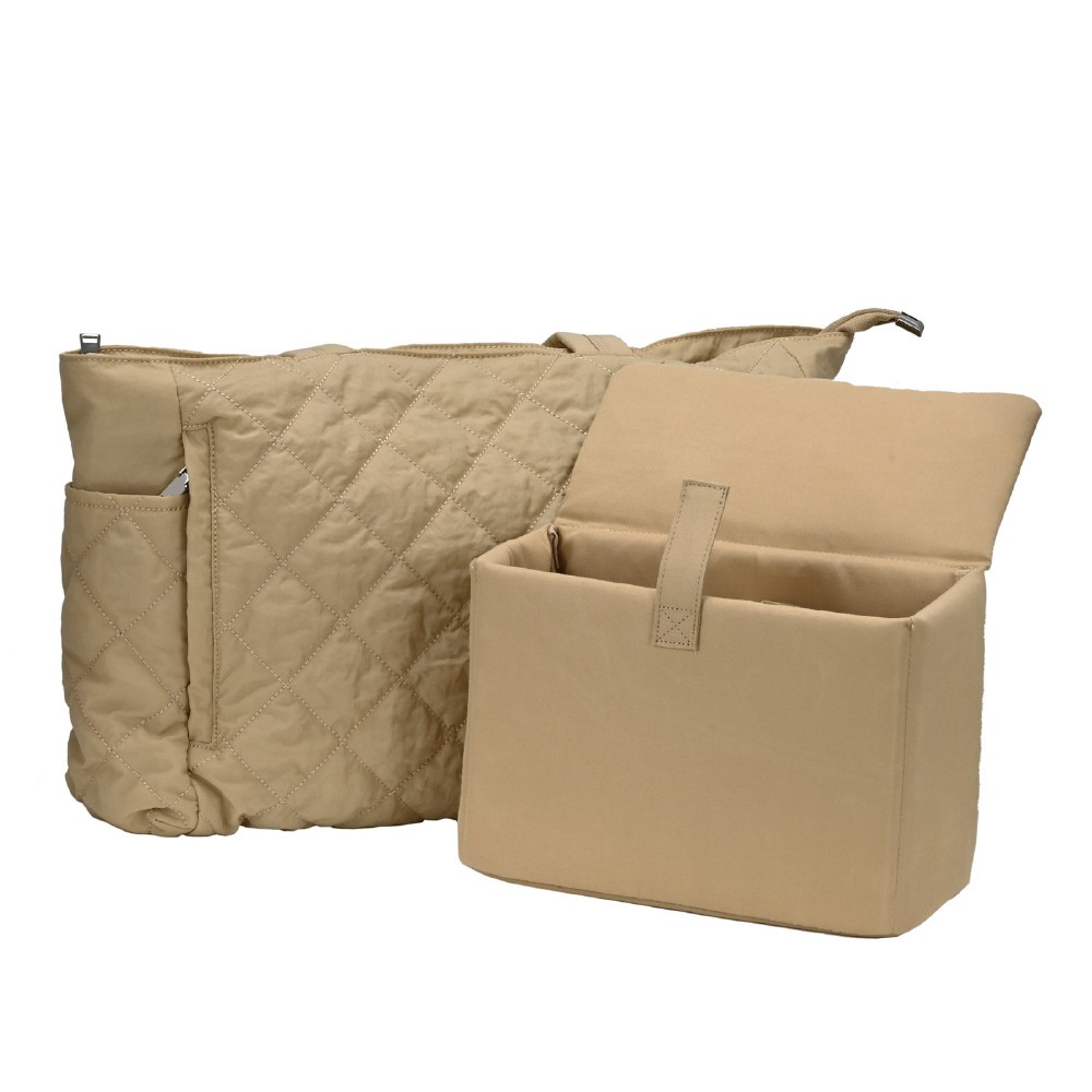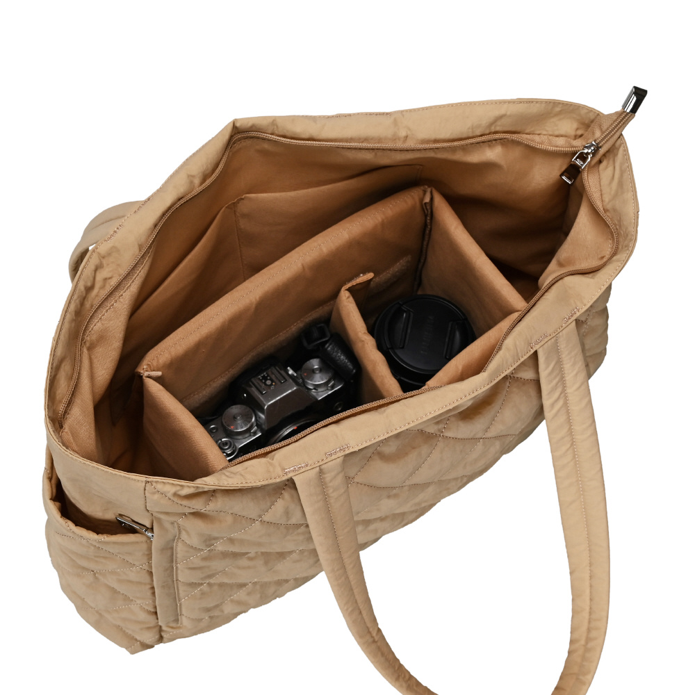 ナチュラルな雰囲気の大きめキルティングトートバッグに、同色のカメラインナーボックスをセット。軽量な生地を使用した、ソフトな手触りのトートバッグです。カメラインナーは衝撃に強い10mm厚の蓋付きボックスタイプ。