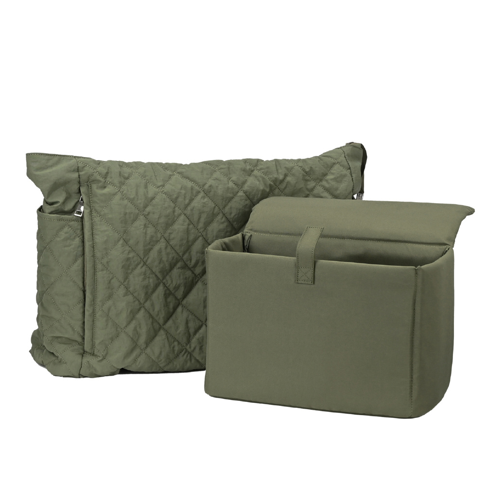ナチュラルな雰囲気の大きめキルティングトートバッグに、同色のカメラインナーボックスをセット。軽量な生地を使用した、ソフトな手触りのトートバッグです。カメラインナーは衝撃に強い10mm厚の蓋付きボックスタイプ。
