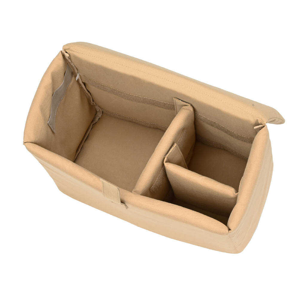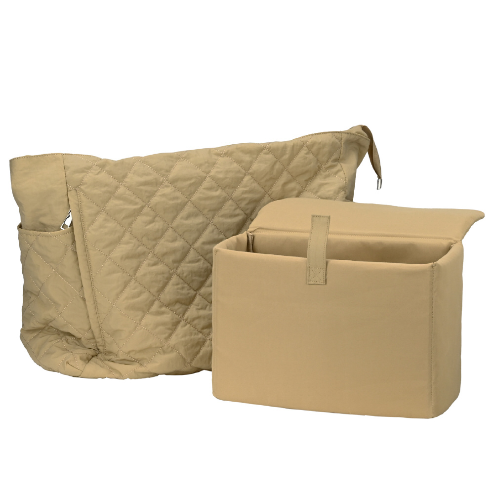 ナチュラルな雰囲気の大きめキルティングトートバッグに、同色のカメラインナーボックスをセット。軽量な生地を使用した、ソフトな手触りのトートバッグです。カメラインナーは衝撃に強い10mm厚の蓋付きボックスタイプ。