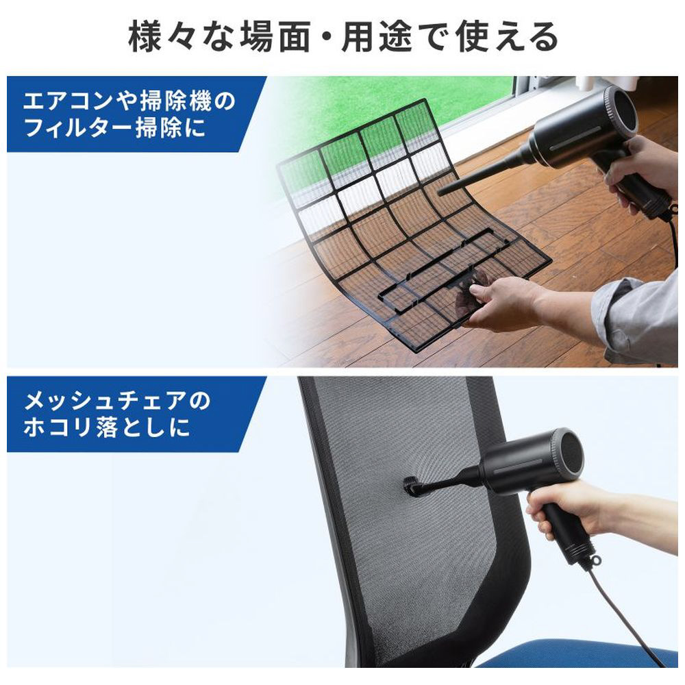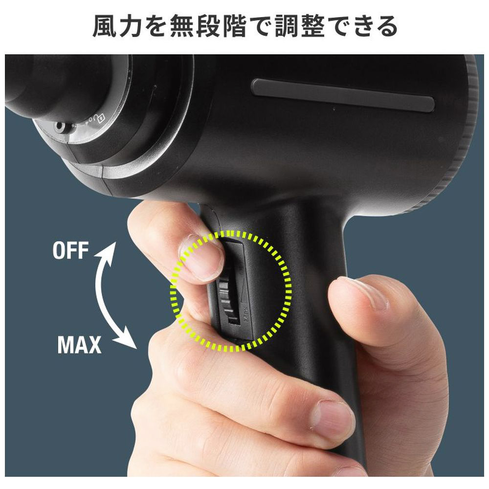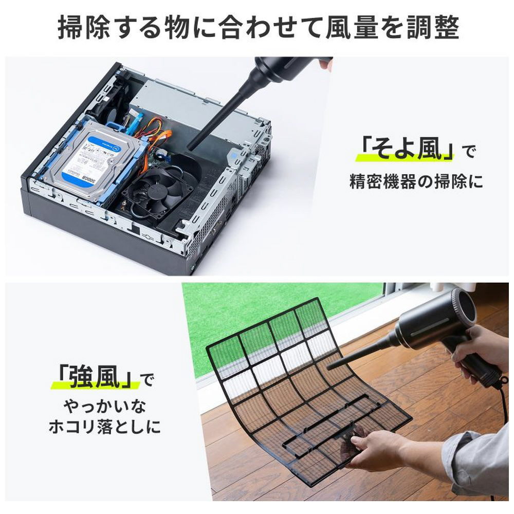 そよ風から42m/s強力噴射まで風量の無段階調整が可能な電動エアダスター、充電不要で風力が強いAC電源タイプ。