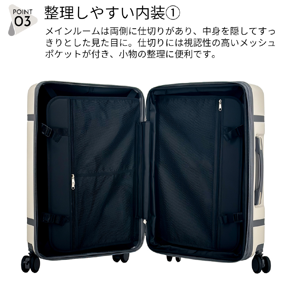 メインルームは両側に仕切り付きで中身を隠せ、見た目もすっきり。仕切りには視認性の高いメッシュポケットが付いており、小物の整理に便利です。さらに、荷物をしっかり押さえるクロスベルトも両側に装備し、移動中の荷崩れを防ぎます。