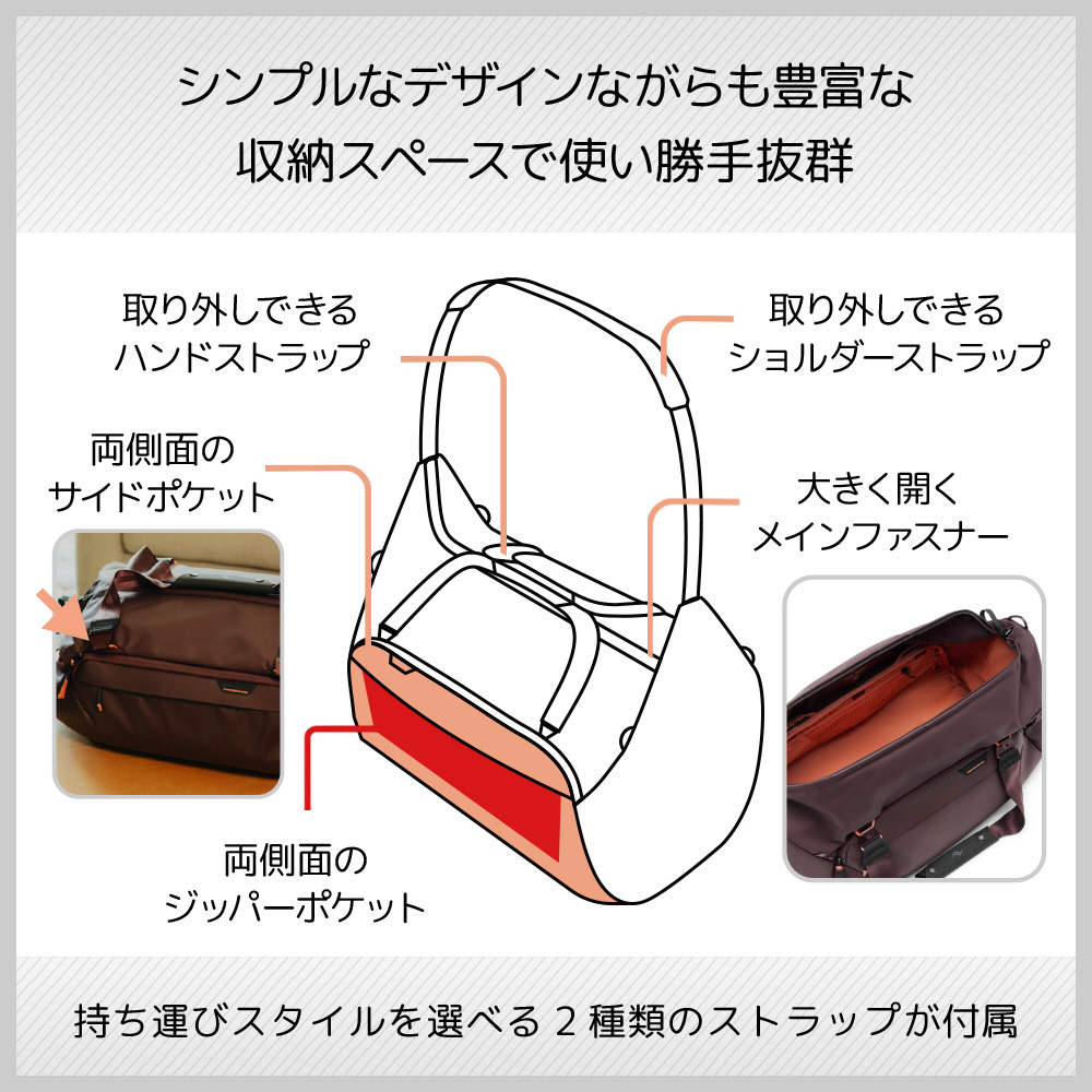 ハンドストラップとショルダーストラップが付属し、どのサイズもボストンバッグ、ショルダーバッグ、バックパッ クスタイルに対応します。
